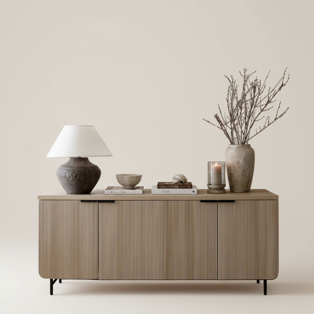 The Eleanor Sideboard is a timeless blend of modern design and classic charm. Its elegantly textured grooved doors and soft natural wood finish evoke a sense of sophistication while offering practical storage solutions. Perfect for enhancing your dining or living area with a touch of understated luxury.