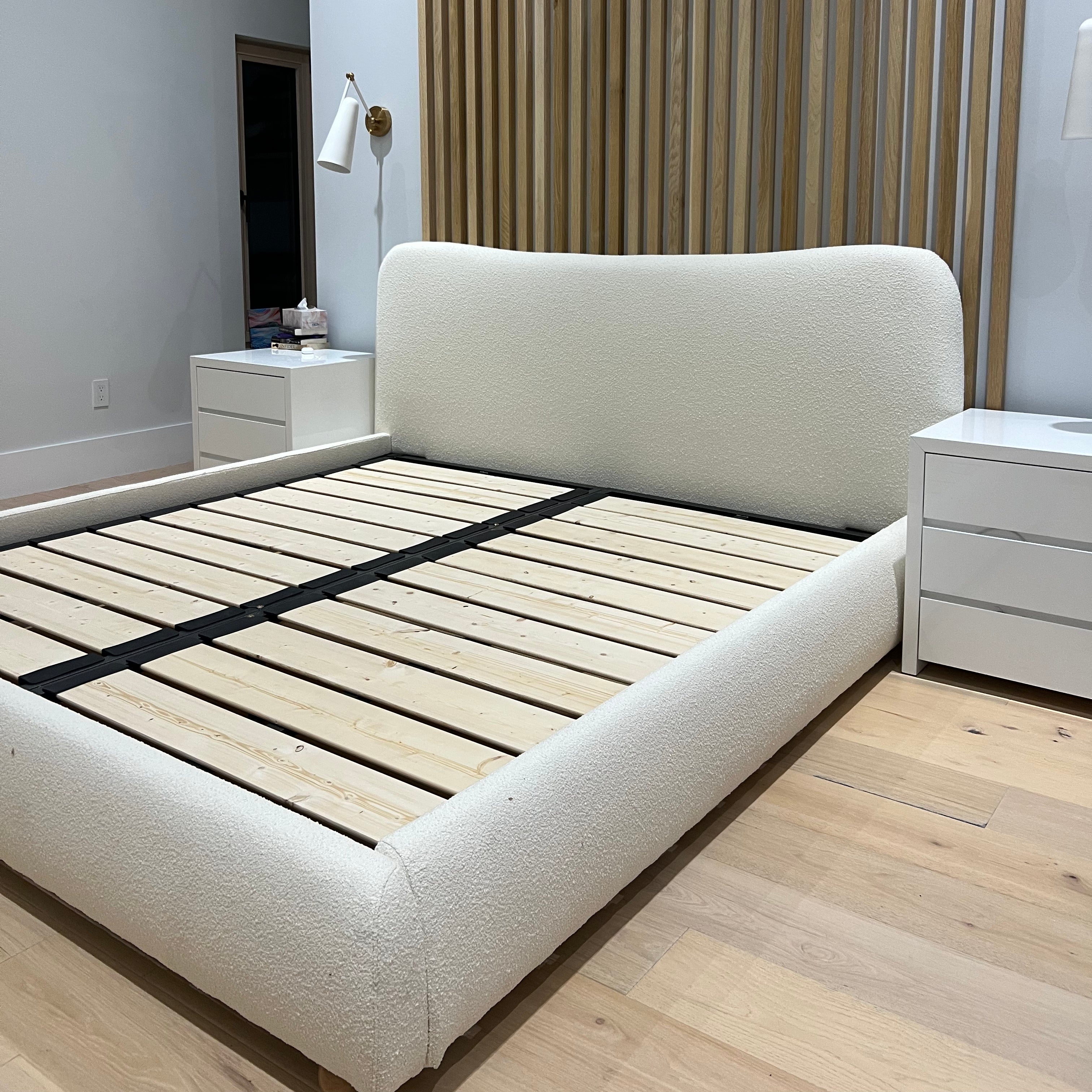 Soft curves meet modern minimalism in the Luma Bouclé Bed. Upholstered in plush ivory Fineloop bouclé, this bed offers a cozy, cocooning feel with a sculptural silhouette. The rounded frame and headboard exude warmth, while solid ash wood legs provide natural grounding and durability. A perfect blend of texture, comfort, and contemporary elegance.