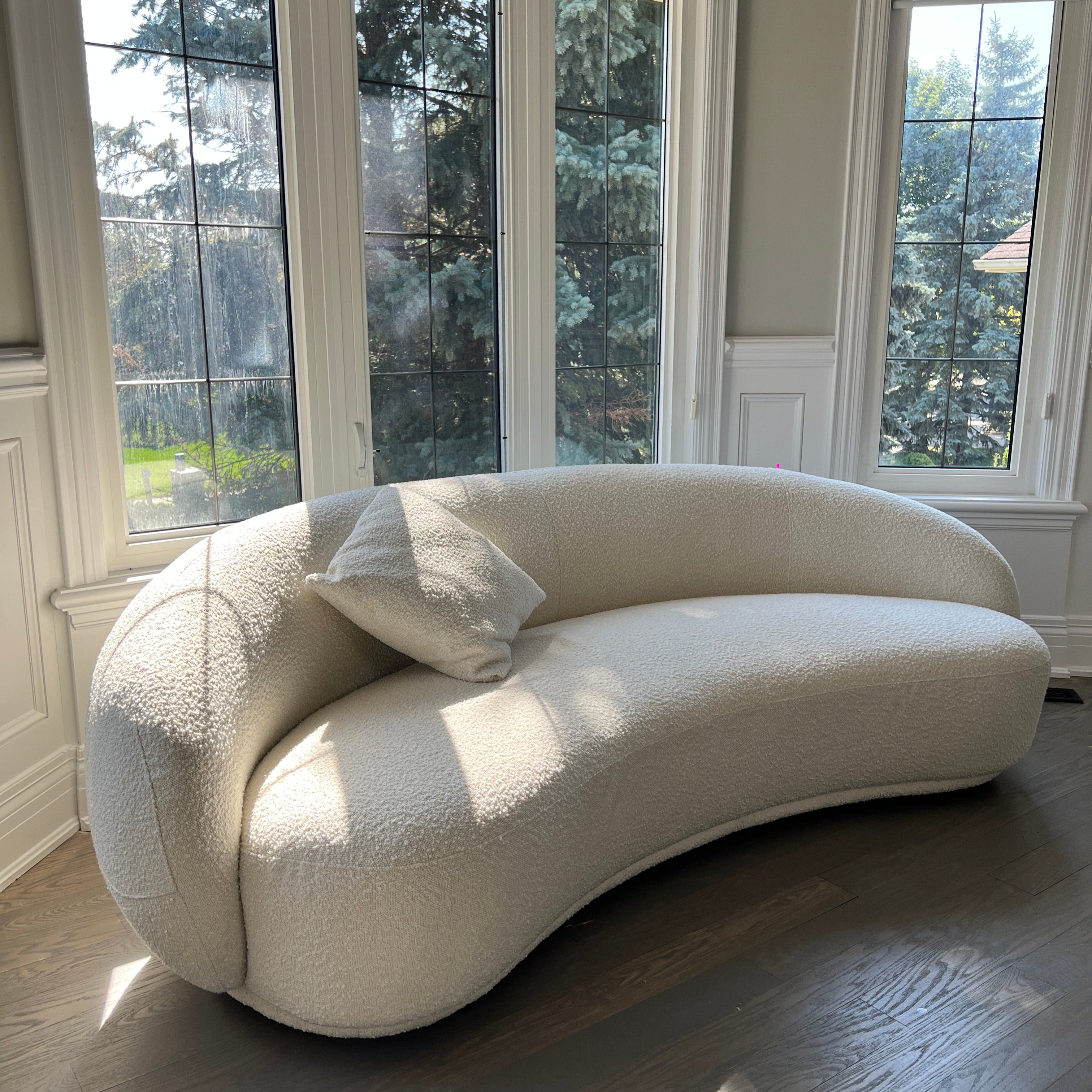 Indulge in the ultimate comfort and modern elegance with the Contour Bliss Bouclé Sofa. This beautifully curved sofa is upholstered in luxurious high-pile bouclé wool, offering a tactile and visual delight. Its sculptural form is designed to hug your body, creating a cozy and inviting seating experience. Whether placed near a fireplace or as a centerpiece, this sofa exudes style and warmth.