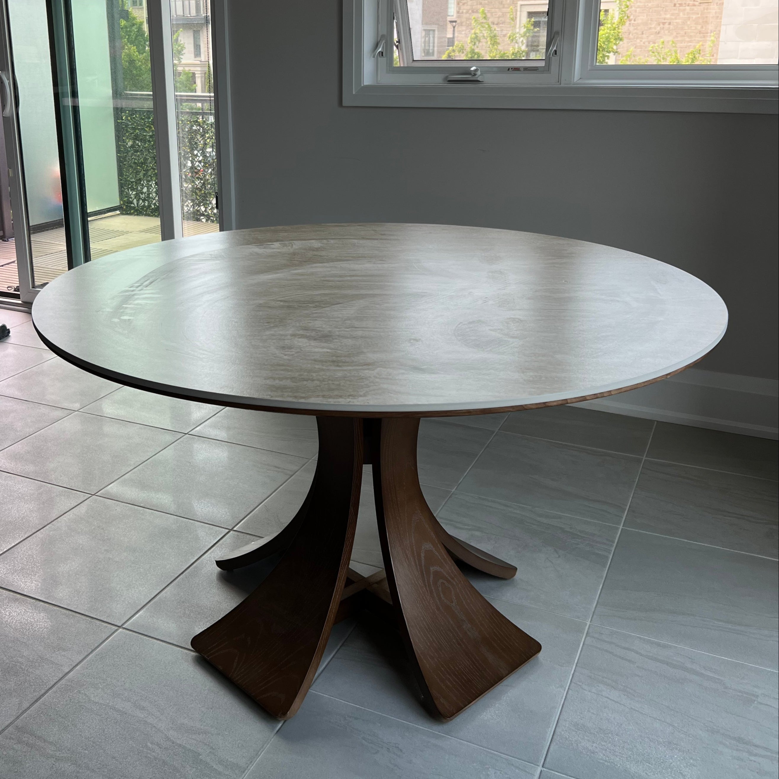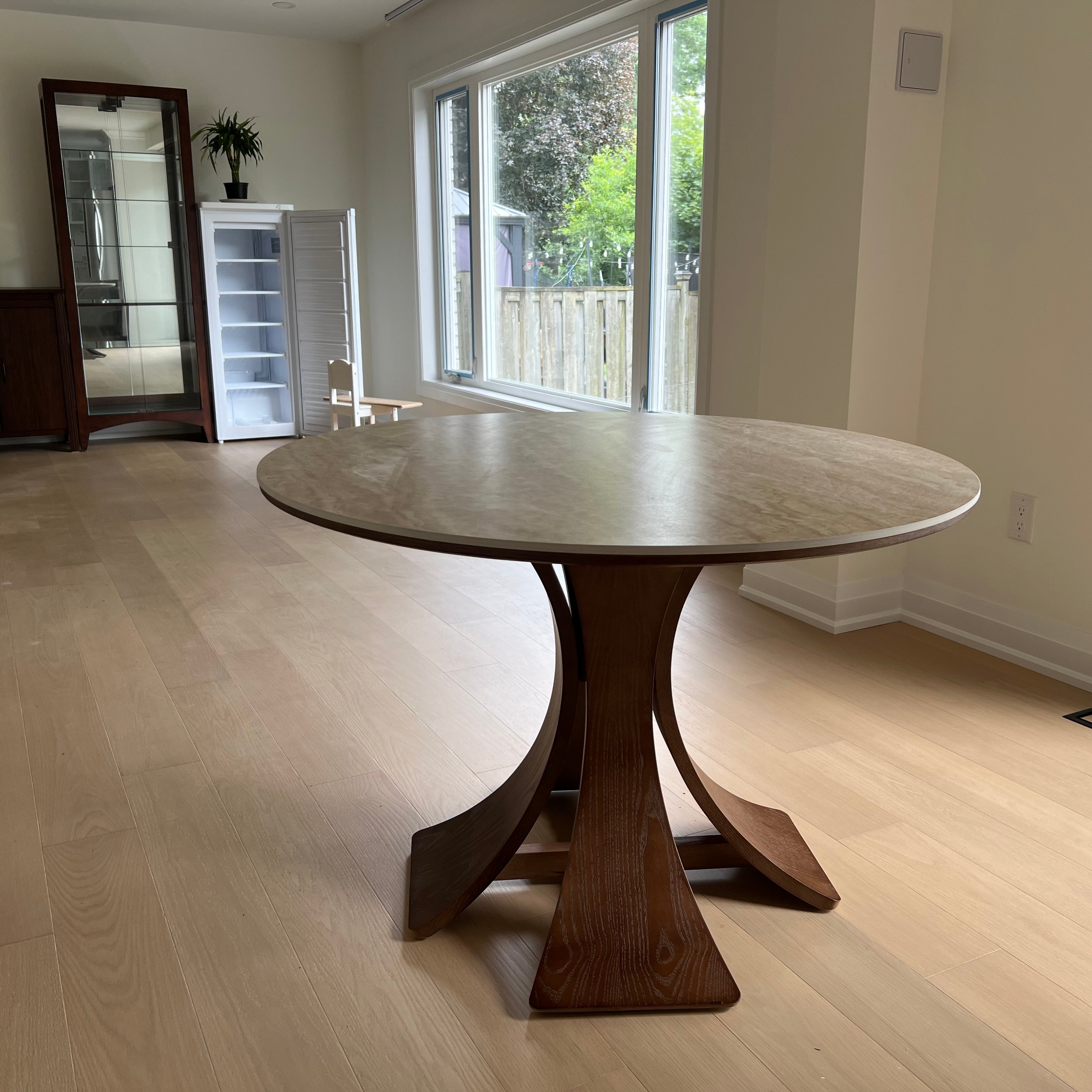 A harmonious blend of sculptural form and natural materials, the Elowen Round Dining Table features a round travertine sintered stone top that rests elegantly atop a sculpted walnut-stained wood base. The base’s organic curves evoke a sense of movement and balance, making it as much a piece of art as it is a functional dining surface. Ideal for intimate gatherings or statement-making centerpieces, this table seamlessly integrates into both modern and classic interiors. Durable, timeless, and refined — the Elowen elevates any dining experience.