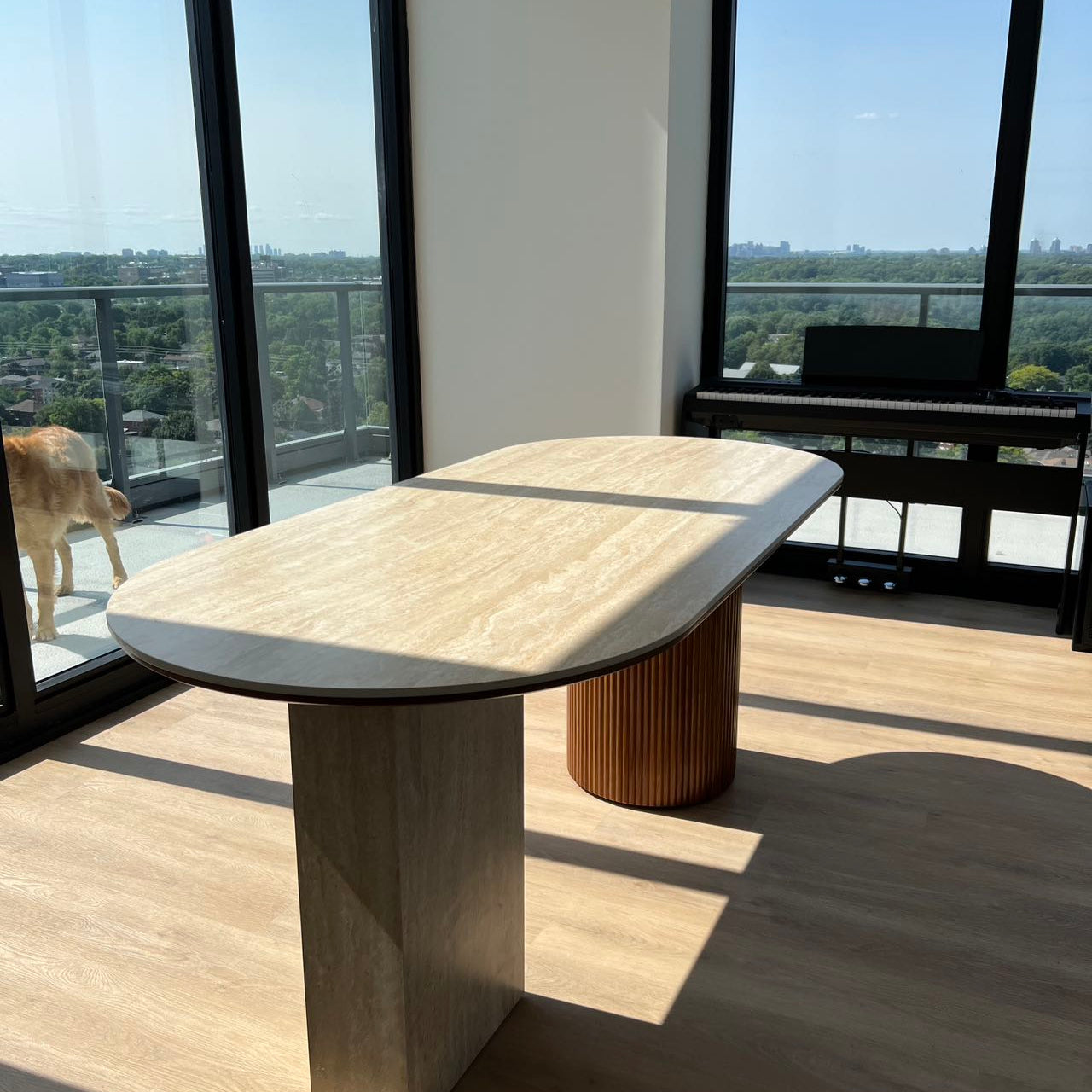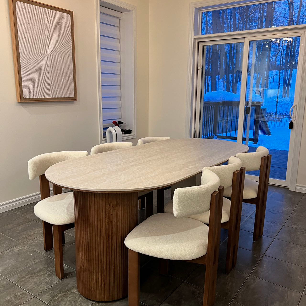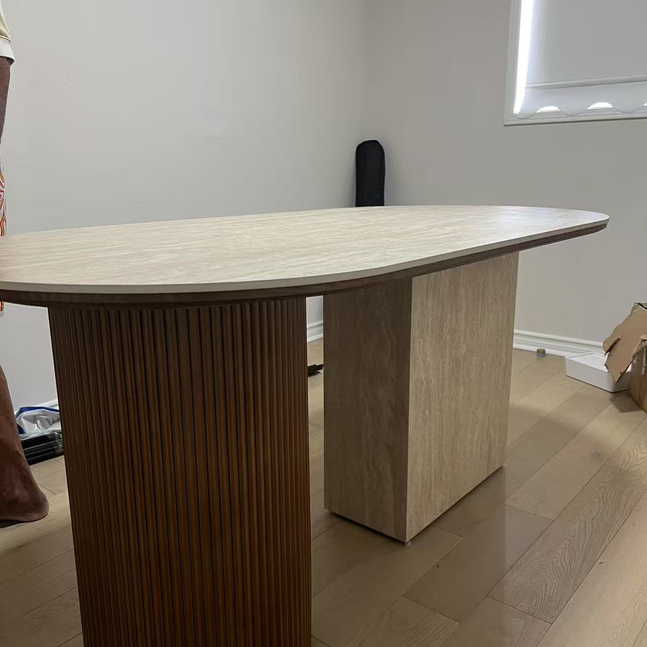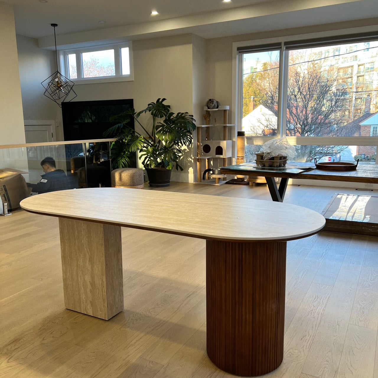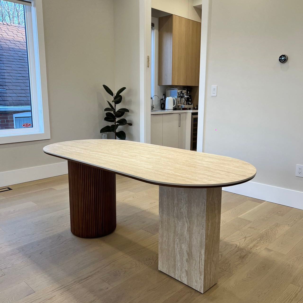 Elevate your dining space with the Gianna Travertine Sintered Stone and Wood Dining Table. This sophisticated table features an elegant oval travertine sintered stone top with unique natural veining, ensuring each piece is one-of-a-kind. The table's base combines solid wood and travertine stone for a balanced, modern look. Ideal for contemporary dining rooms, this table offers both aesthetic appeal and functionality, serving as a stunning focal point for gatherings and everyday meals.