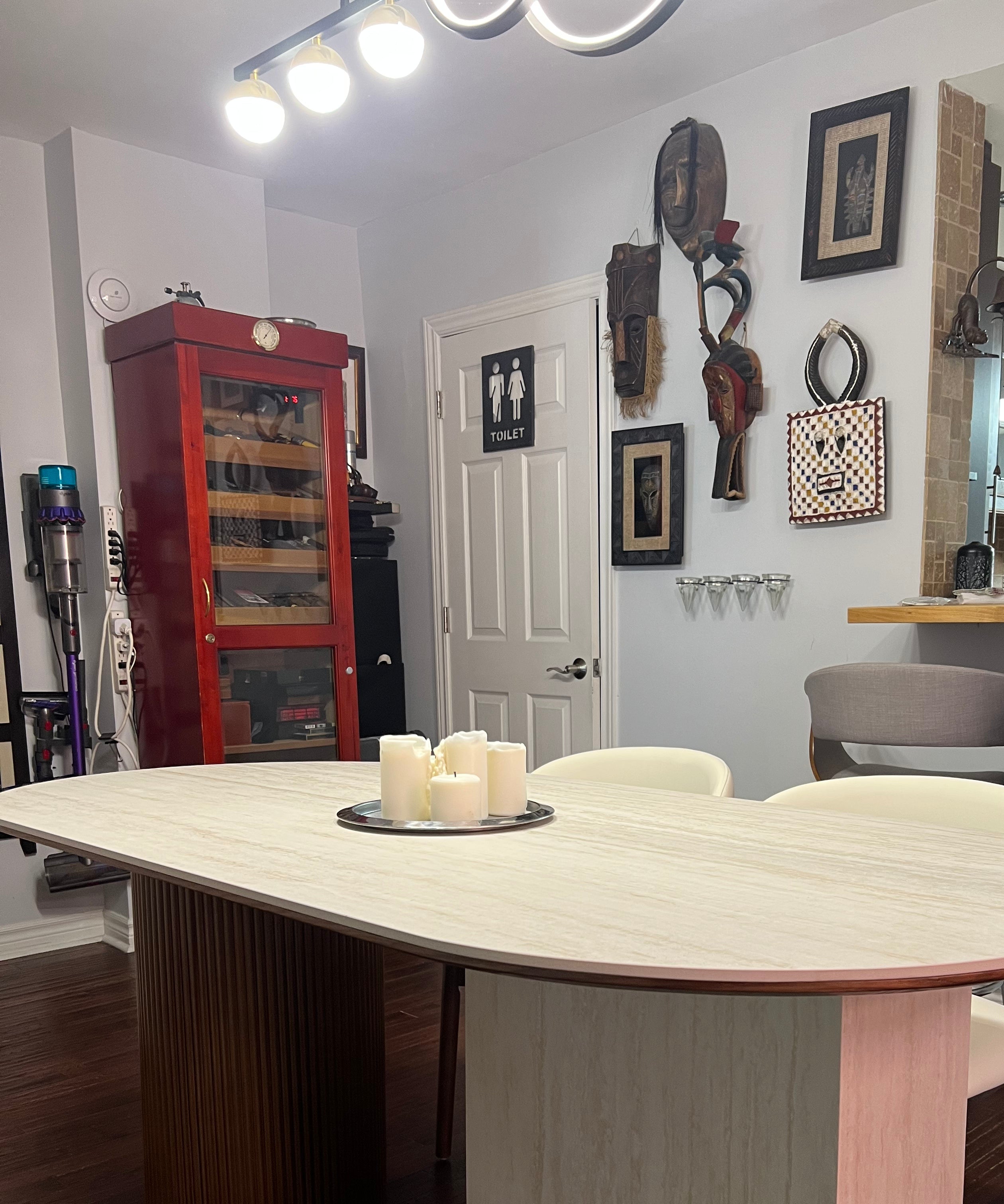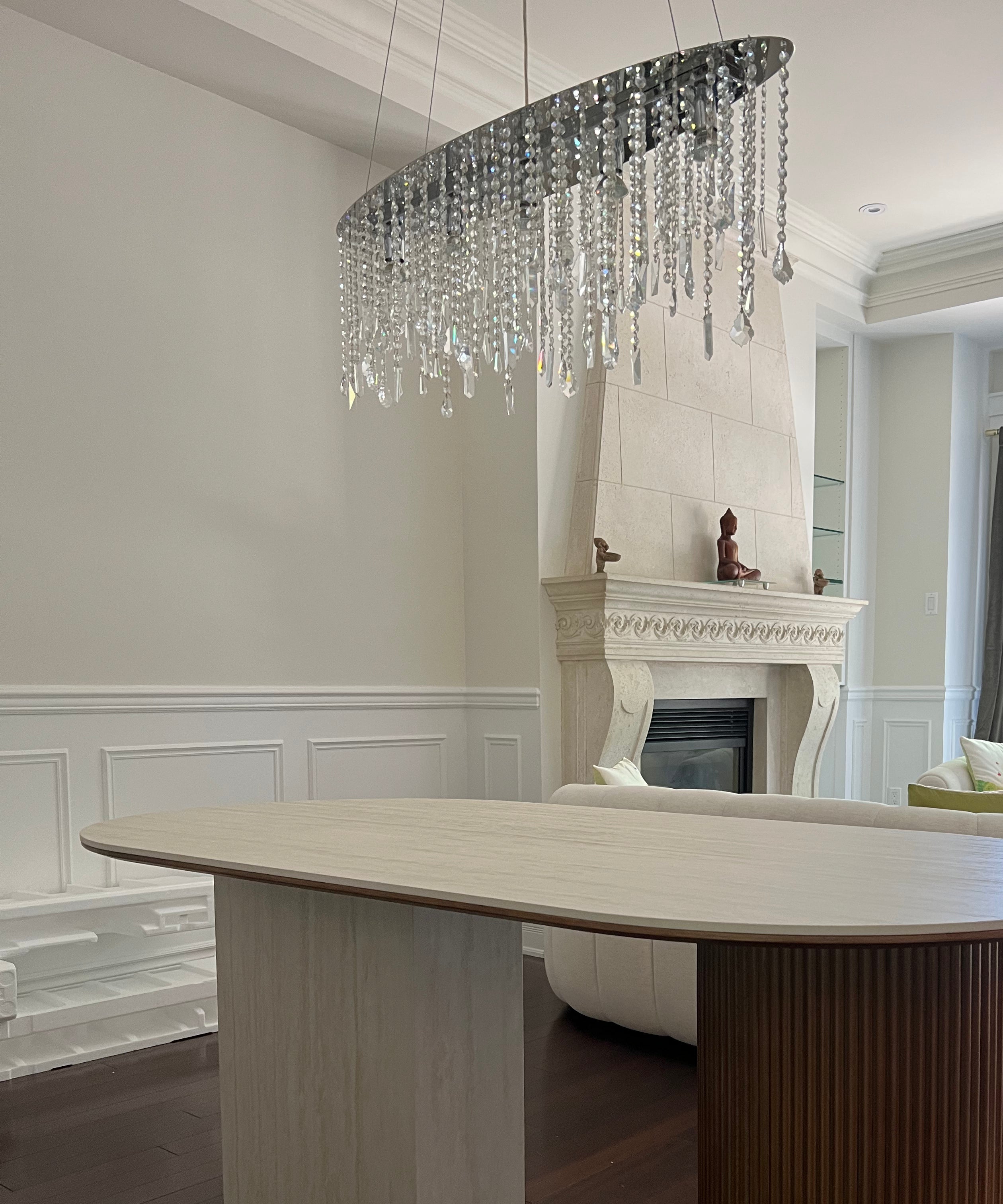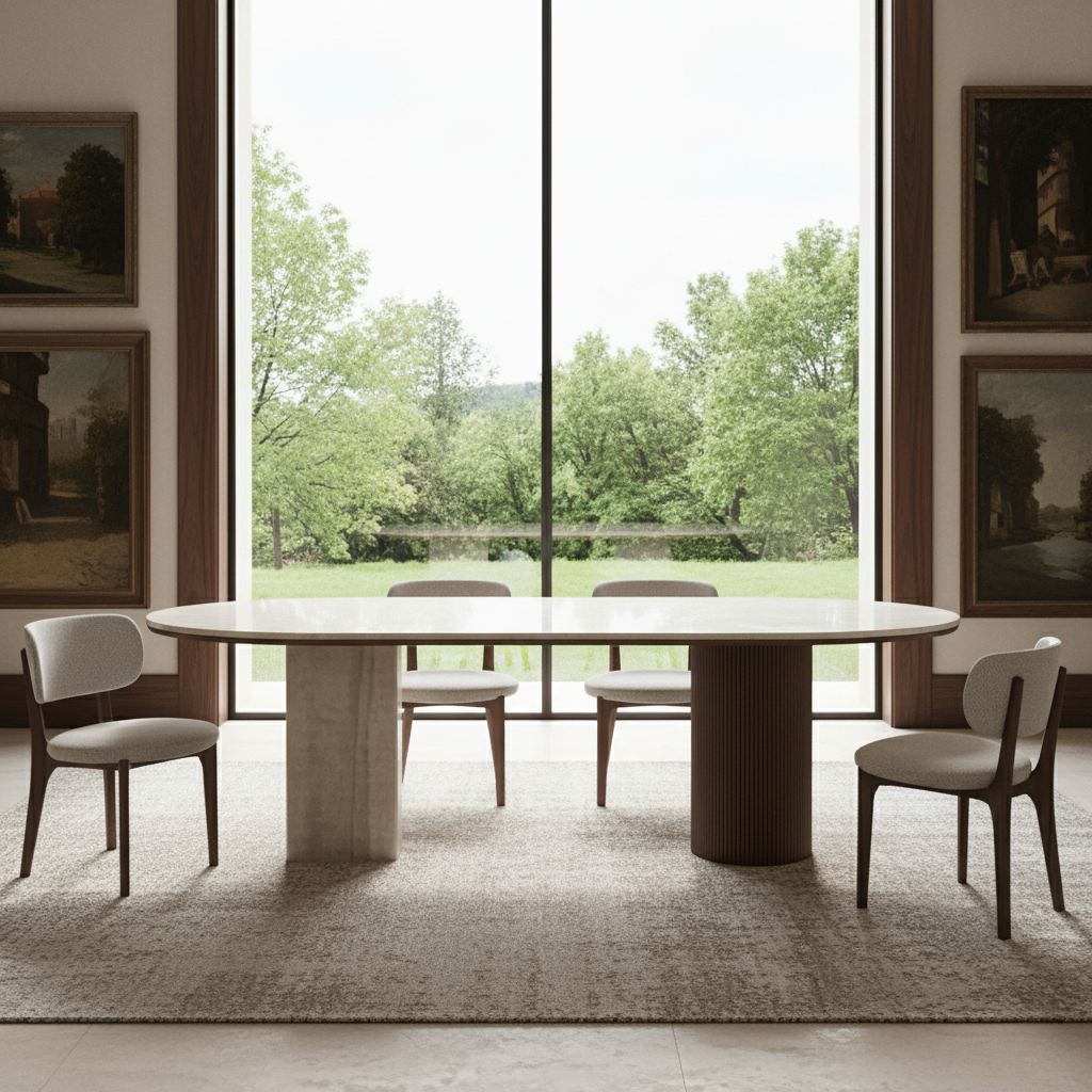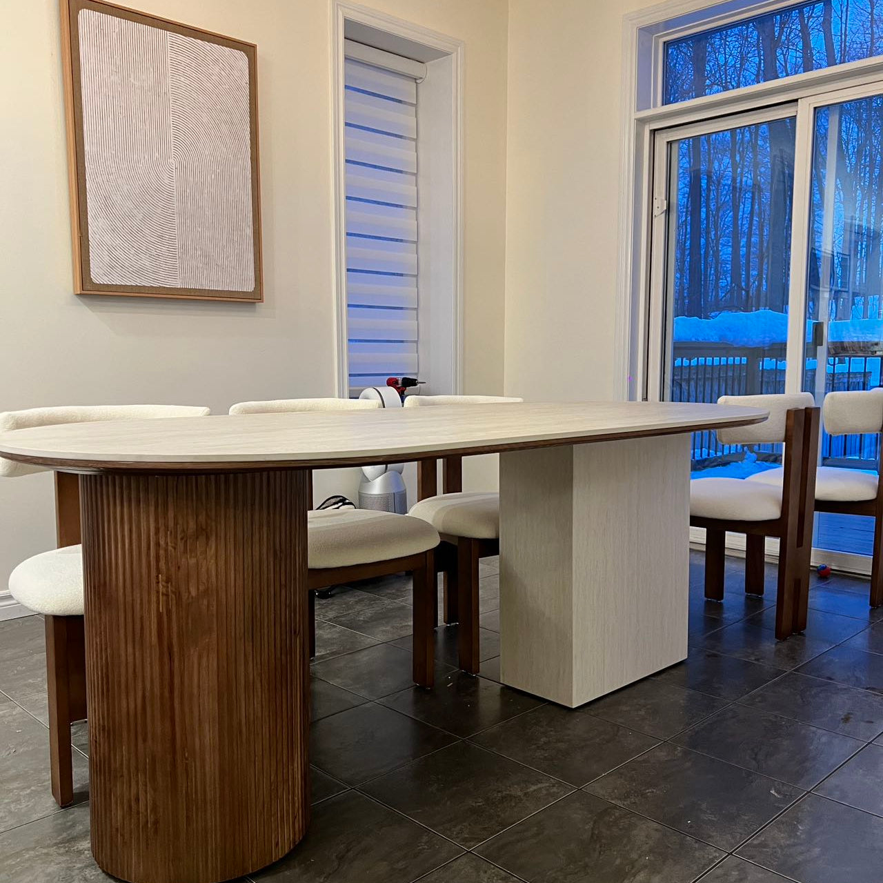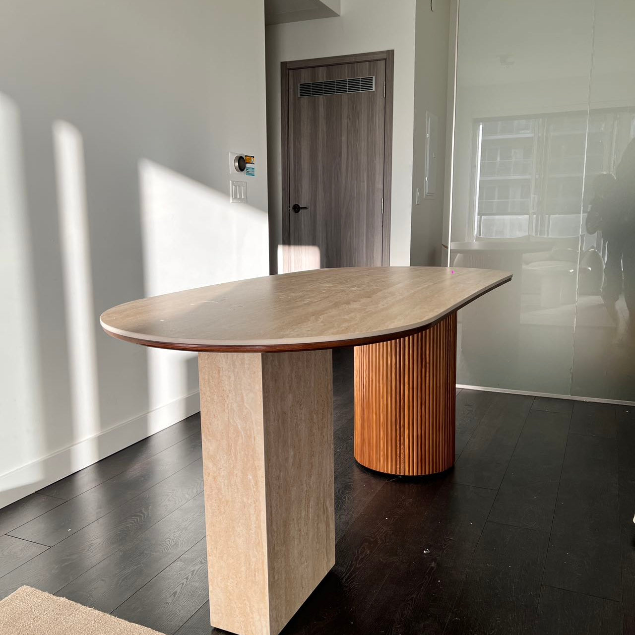 Elevate your dining space with the Gianna Travertine Sintered Stone and Wood Dining Table. This sophisticated table features an elegant oval travertine sintered stone top with unique natural veining, ensuring each piece is one-of-a-kind. The table's base combines solid wood and travertine stone for a balanced, modern look. Ideal for contemporary dining rooms, this table offers both aesthetic appeal and functionality, serving as a stunning focal point for gatherings and everyday meals.