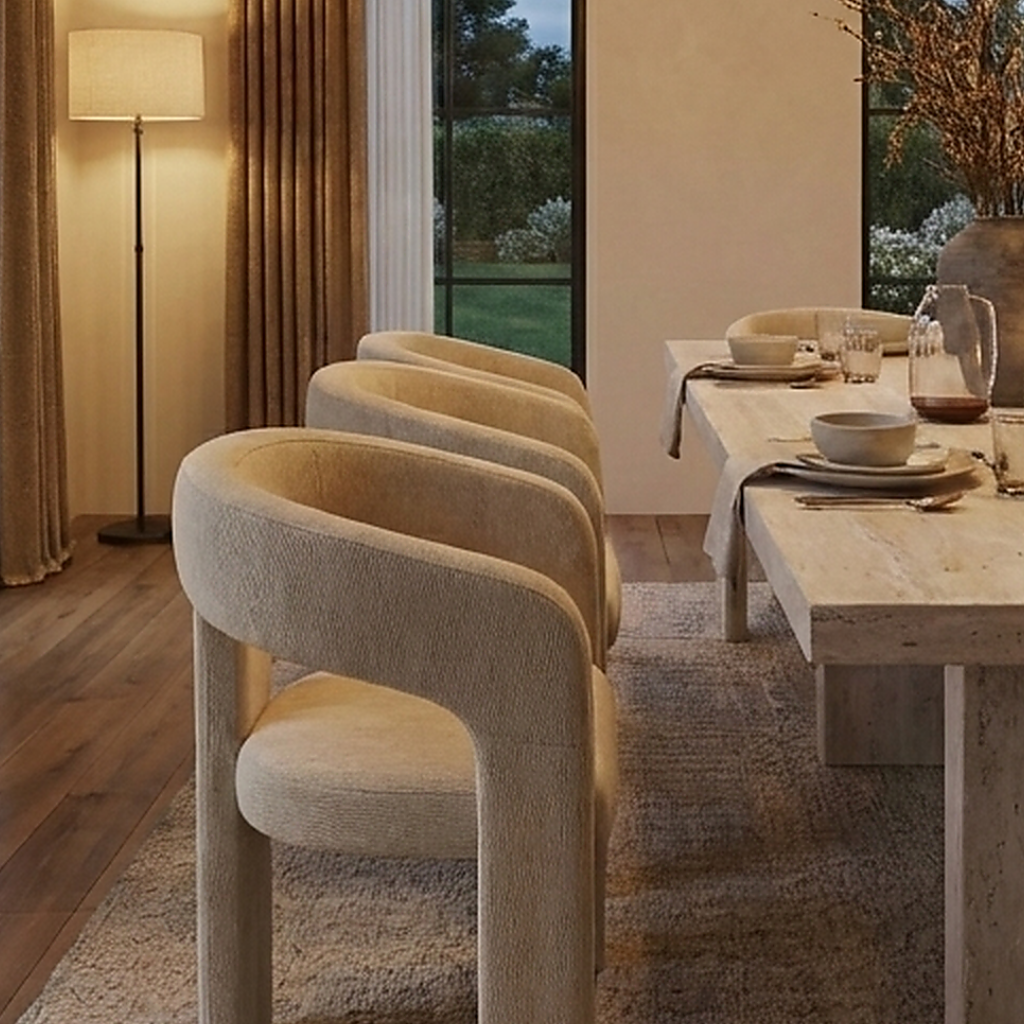 The Archway Dining Chair is a modern masterpiece that combines architectural elegance with everyday comfort. Its unique arched backrest and smooth curves create a sculptural form that brings both sophistication and a minimalist aesthetic to your dining space. Upholstered in a soft, textured fabric, the chair provides a plush seating experience, while its sturdy frame ensures durability. The neutral tones of the chair make it versatile, fitting seamlessly into various interior styles, from contemporary to minimalist.