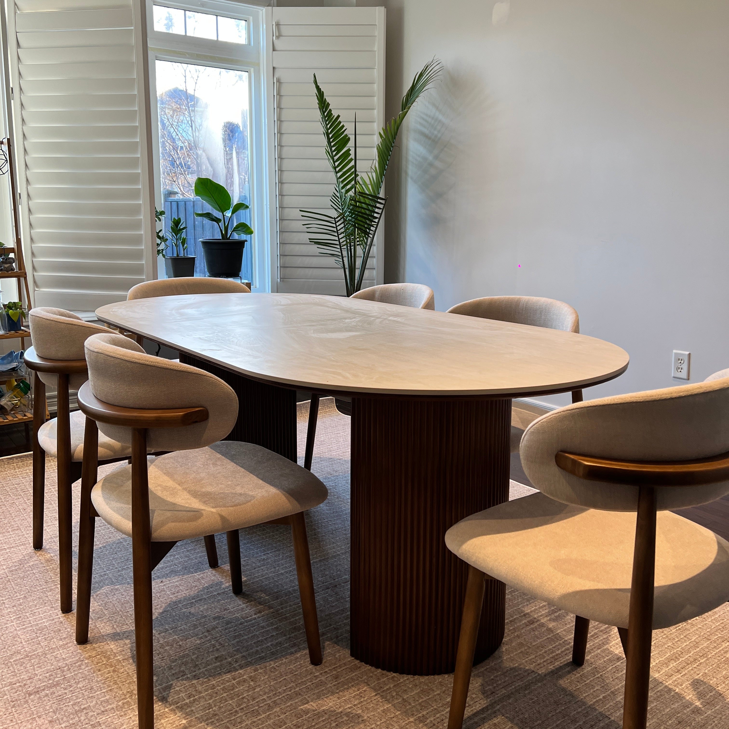 The standout feature of the Crescent Grove Dining Table is its unique dual pedestal base. Each pedestal boasts a fluted design that adds texture and sophistication, creating a harmonious balance between modern aesthetics and classic charm. The sturdy construction ensures durability, making it a perfect centerpiece for both daily meals and special gatherings.