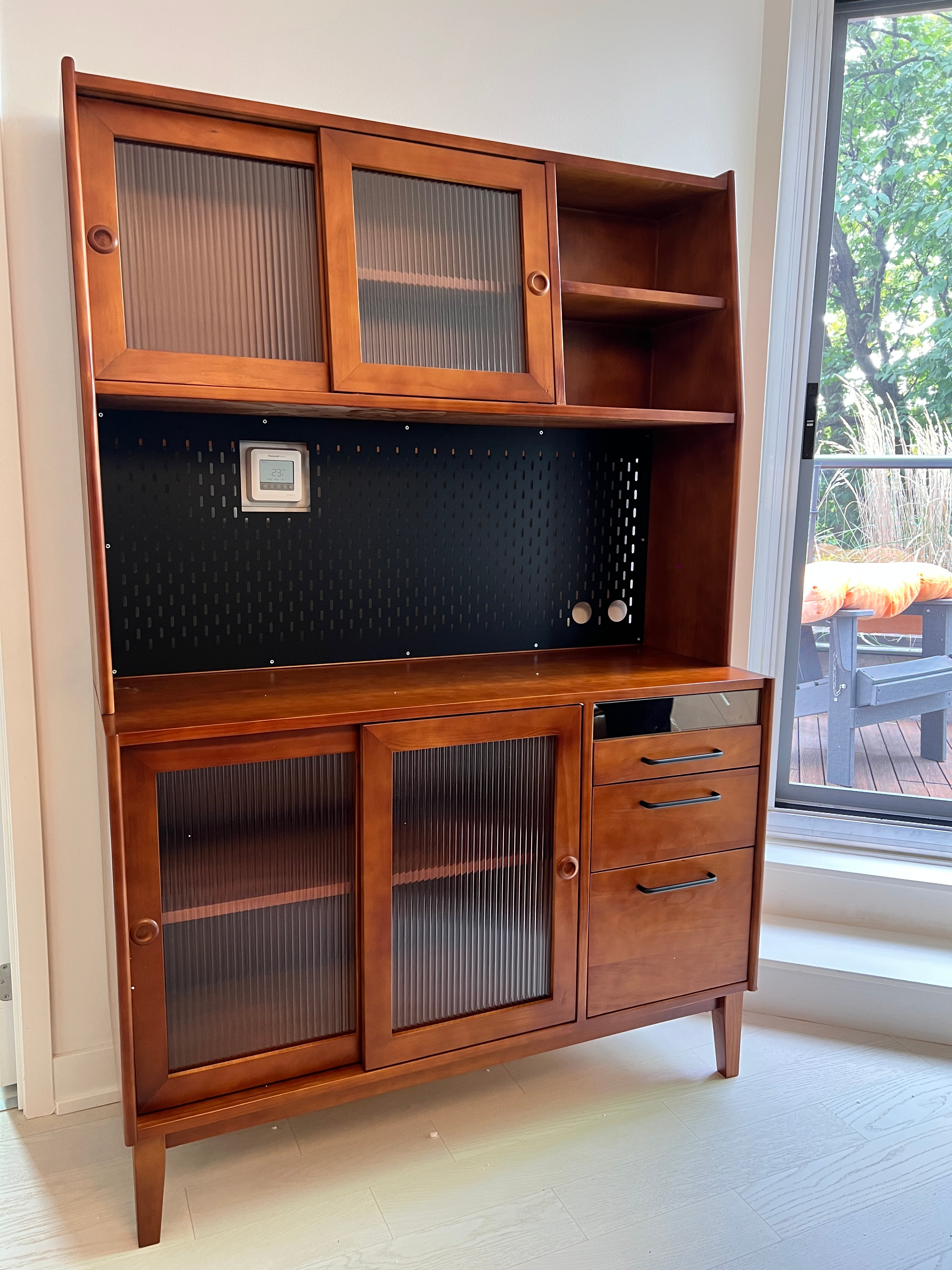 Enhance your kitchen or dining area with the Rustic Coffee & Kitchen Sideboard. This multifunctional piece features a rich solid wood material, ample storage space, and a dedicated coffee station. The upper cabinets with ribbed glass doors provide an elegant display area, while the lower section offers drawers and shelves for additional storage. The sideboard’s open middle shelf is perfect for organizing coffee essentials, from mugs to coffee makers. Ideal for those who love a blend of style and functionality, this sideboard is a perfect addition to any modern home.