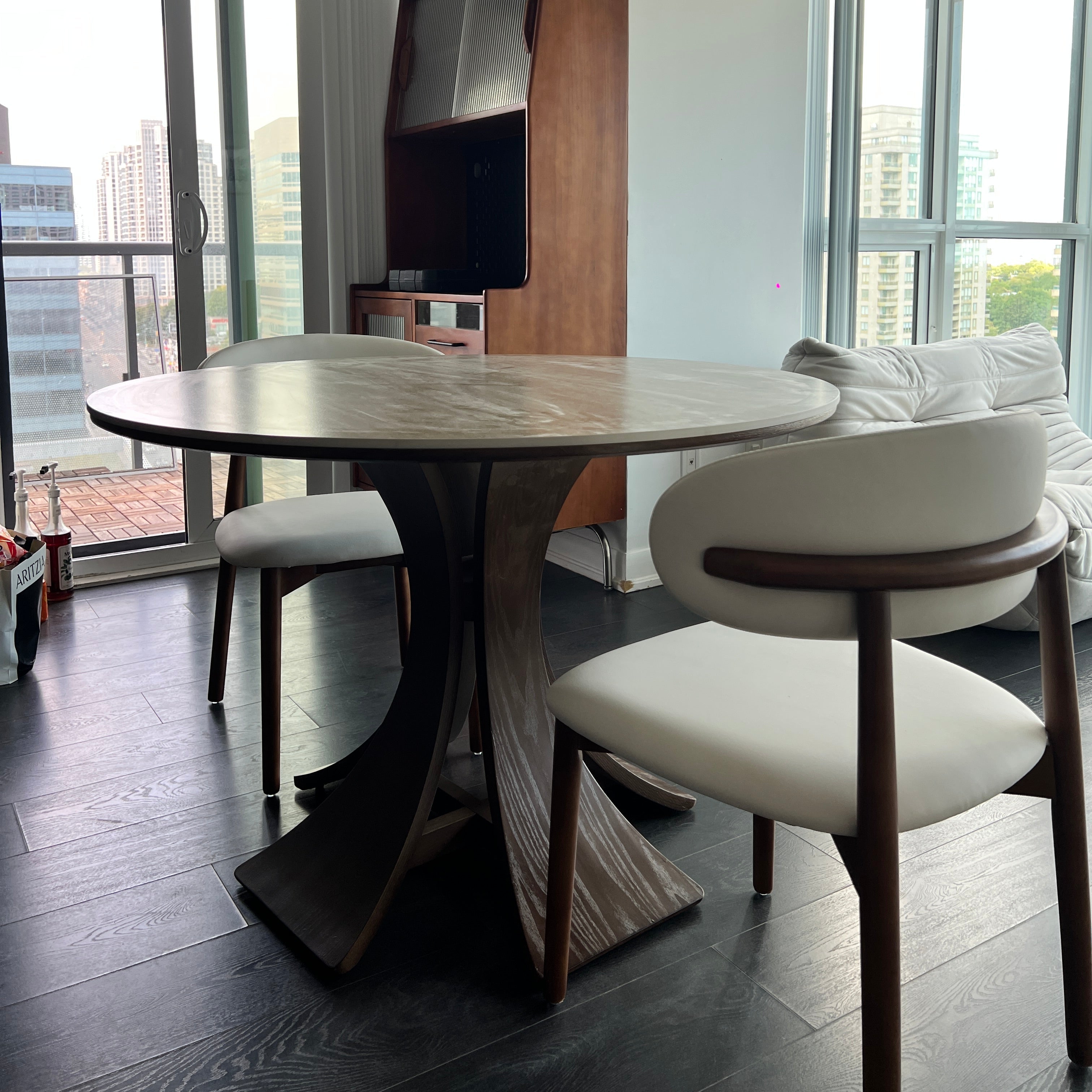 A harmonious blend of sculptural form and natural materials, the Elowen Round Dining Table features a round travertine sintered stone top that rests elegantly atop a sculpted walnut-stained wood base. The base’s organic curves evoke a sense of movement and balance, making it as much a piece of art as it is a functional dining surface. Ideal for intimate gatherings or statement-making centerpieces, this table seamlessly integrates into both modern and classic interiors. Durable, timeless, and refined — the Elowen elevates any dining experience.