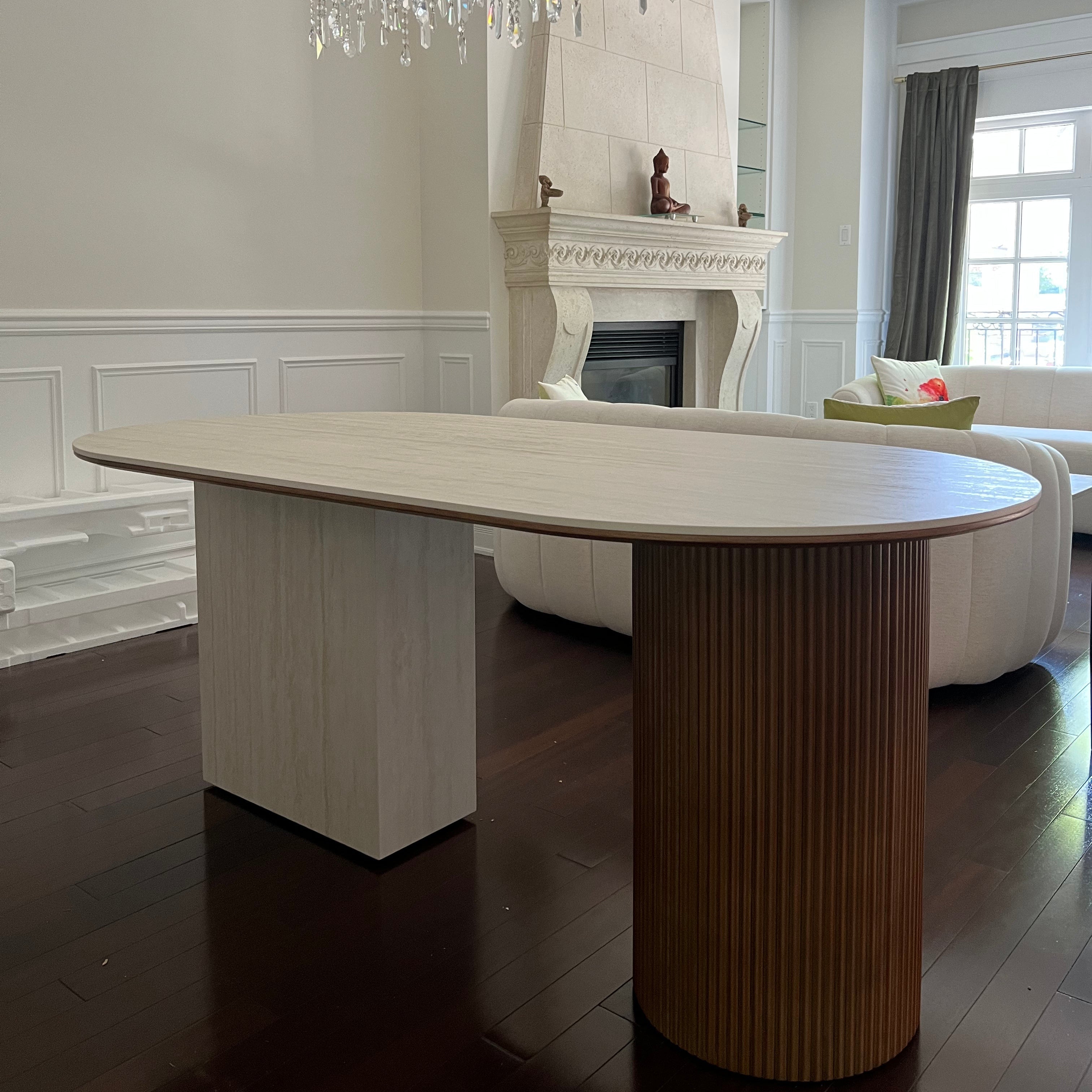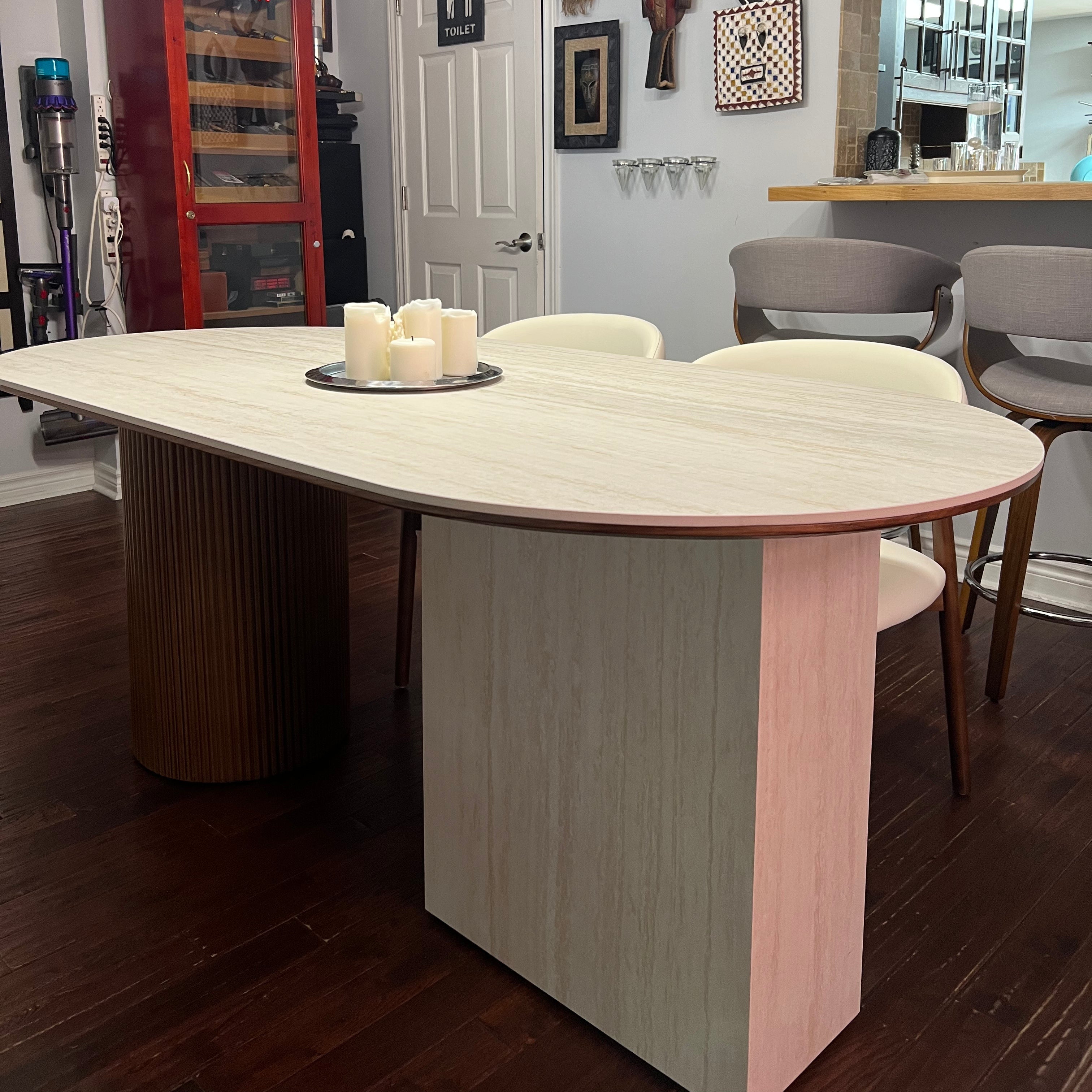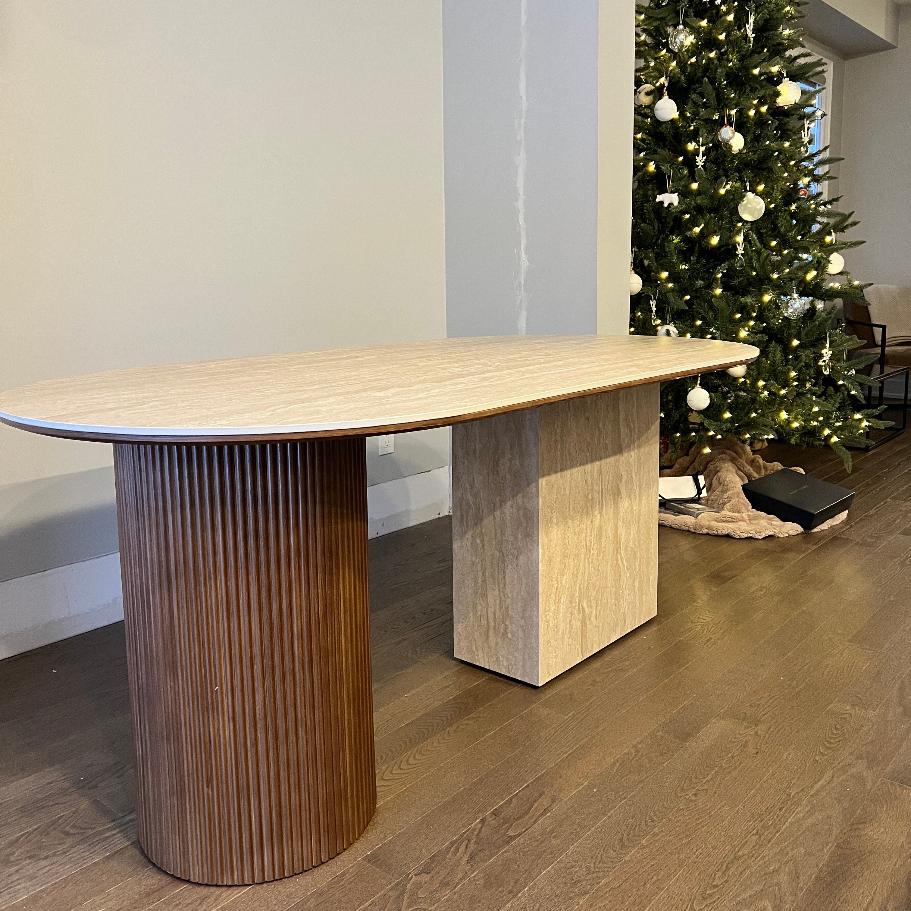 Elevate your dining space with the Gianna Travertine Sintered Stone and Wood Dining Table. This sophisticated table features an elegant oval travertine sintered stone top with unique natural veining, ensuring each piece is one-of-a-kind. The table's base combines solid wood and travertine stone for a balanced, modern look. Ideal for contemporary dining rooms, this table offers both aesthetic appeal and functionality, serving as a stunning focal point for gatherings and everyday meals.