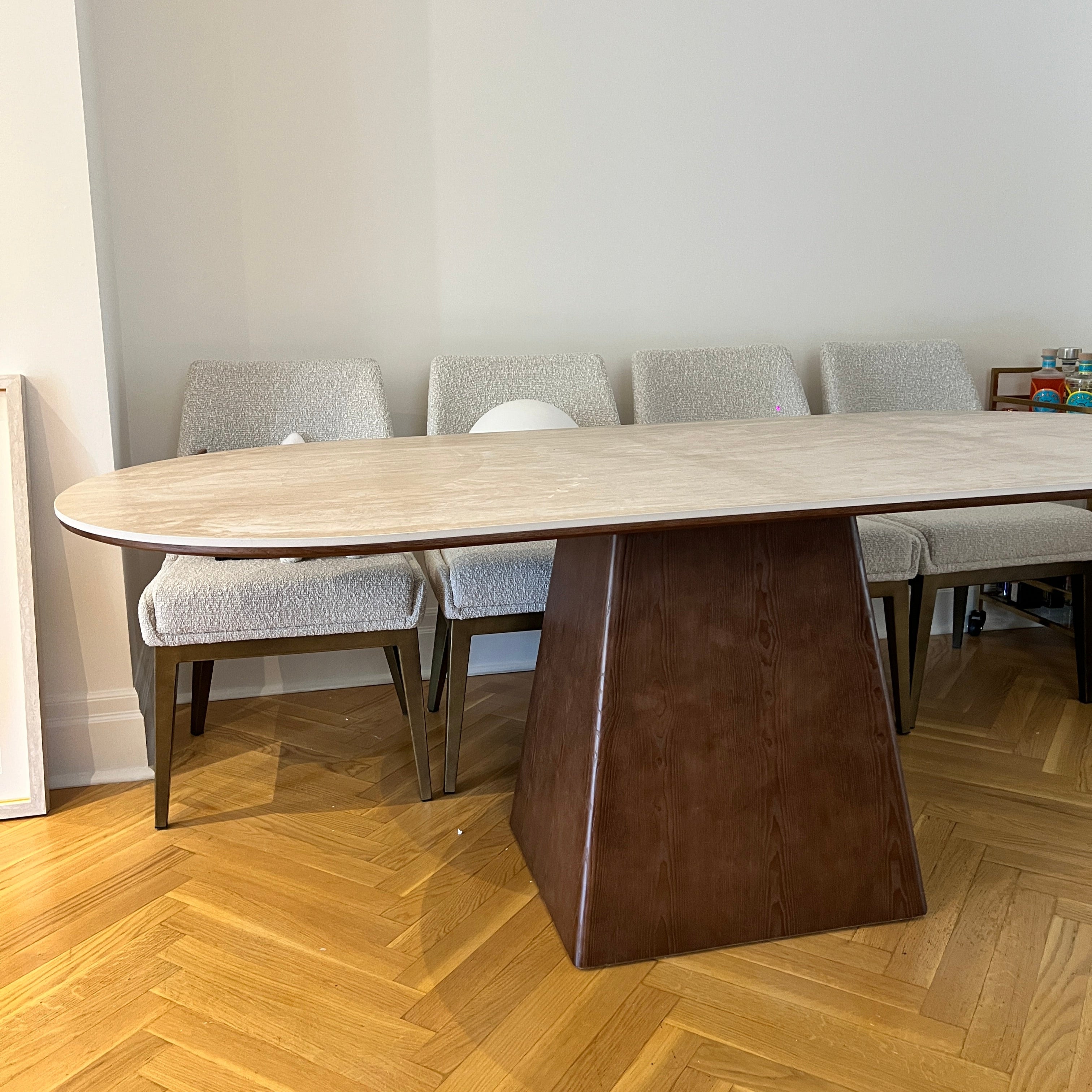 Refined yet grounded, the Sorella Pedestal Table features a sculptural solid wood base paired with a round sintered stone top in a travertine look. Its curved pedestal design offers both visual softness and sturdy support, making it ideal for intimate dining settings. The creamy stone finish adds a modern organic touch, while the walnut-toned base brings warmth and contrast. A timeless centerpiece for contemporary or transitional interiors.