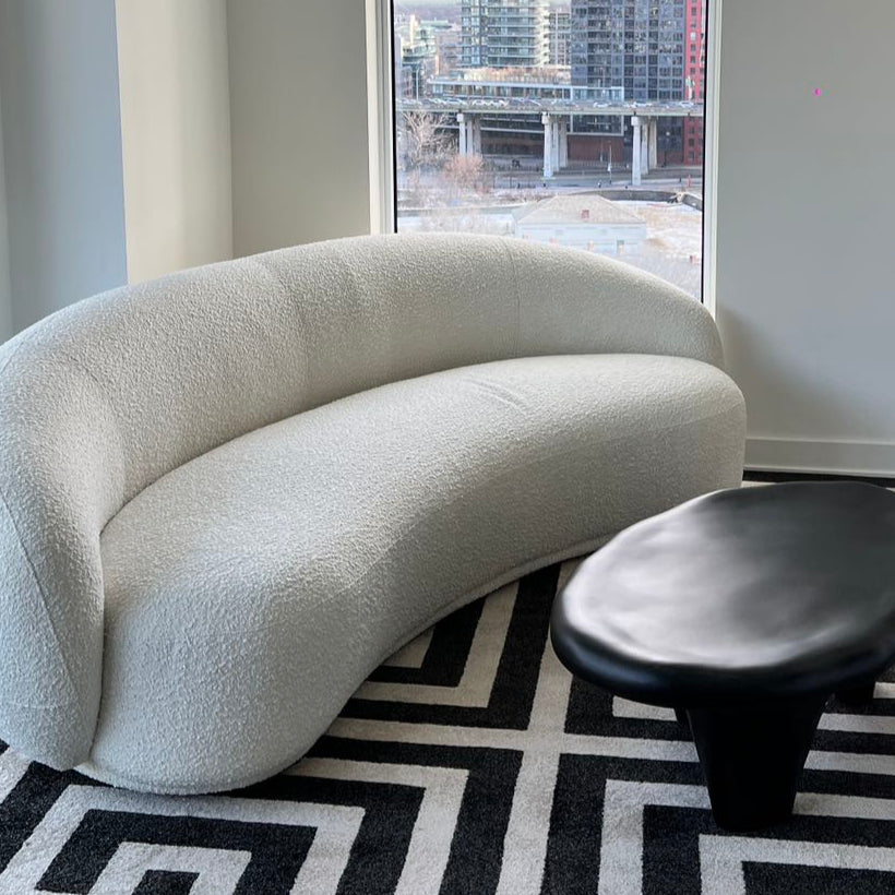 Indulge in the ultimate comfort and modern elegance with the Contour Bliss Bouclé Sofa. This beautifully curved sofa is upholstered in luxurious high-pile bouclé wool, offering a tactile and visual delight. Its sculptural form is designed to hug your body, creating a cozy and inviting seating experience. Whether placed near a fireplace or as a centerpiece, this sofa exudes style and warmth.
