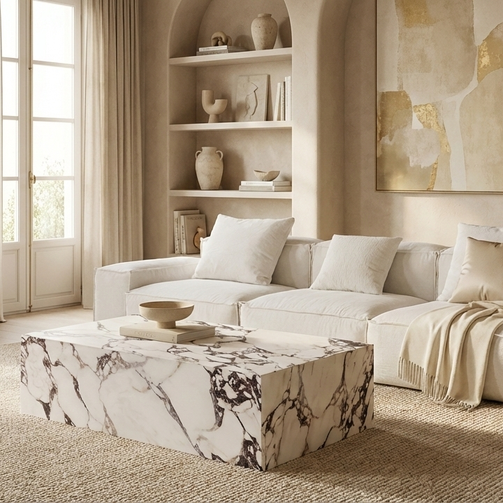 Introducing the "Bulgari Charm" Coffee Table, a statement piece that seamlessly blends the timeless beauty of premium sintered stone with contemporary design. This monolithic table is crafted from the finest Bulgari sintered stone, renowned for its deep veins and rich whorls of grey and burgundy set against a luminous white background. Each table is a unique piece of art, with patterns that tell a story millions of years in the making.