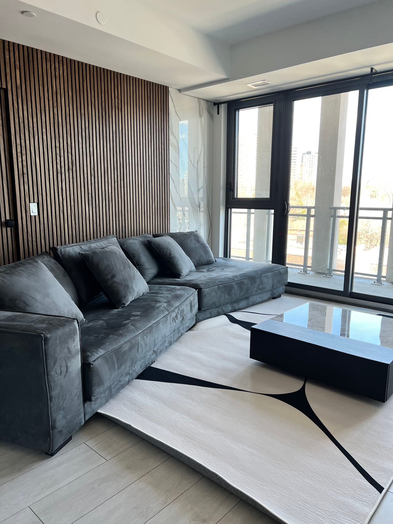 This contemporary sectional sofa features a luxurious dark grey upholstery, offering both a sleek look and a soft, inviting texture. Its modular design includes a chaise lounge, providing ample space for relaxation.