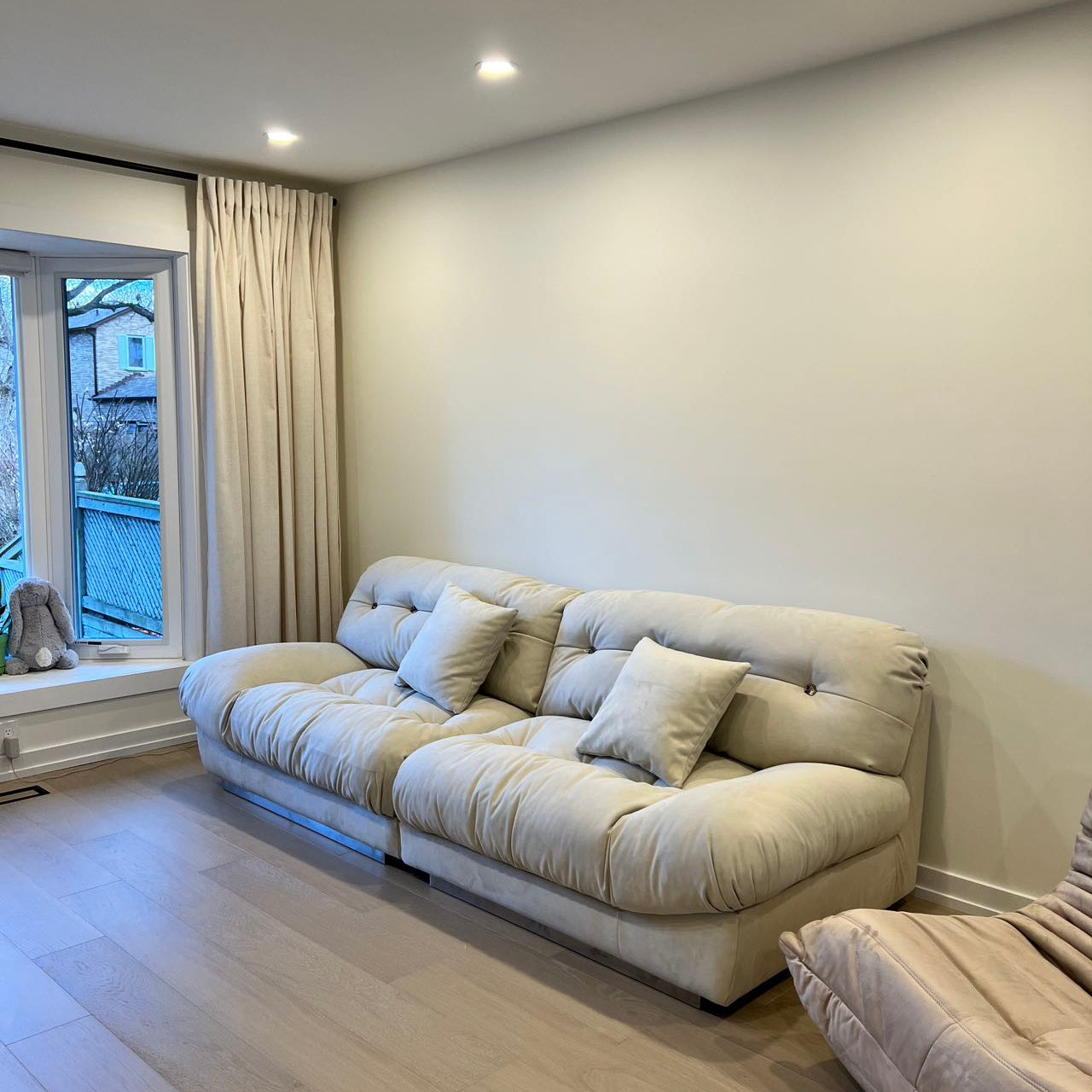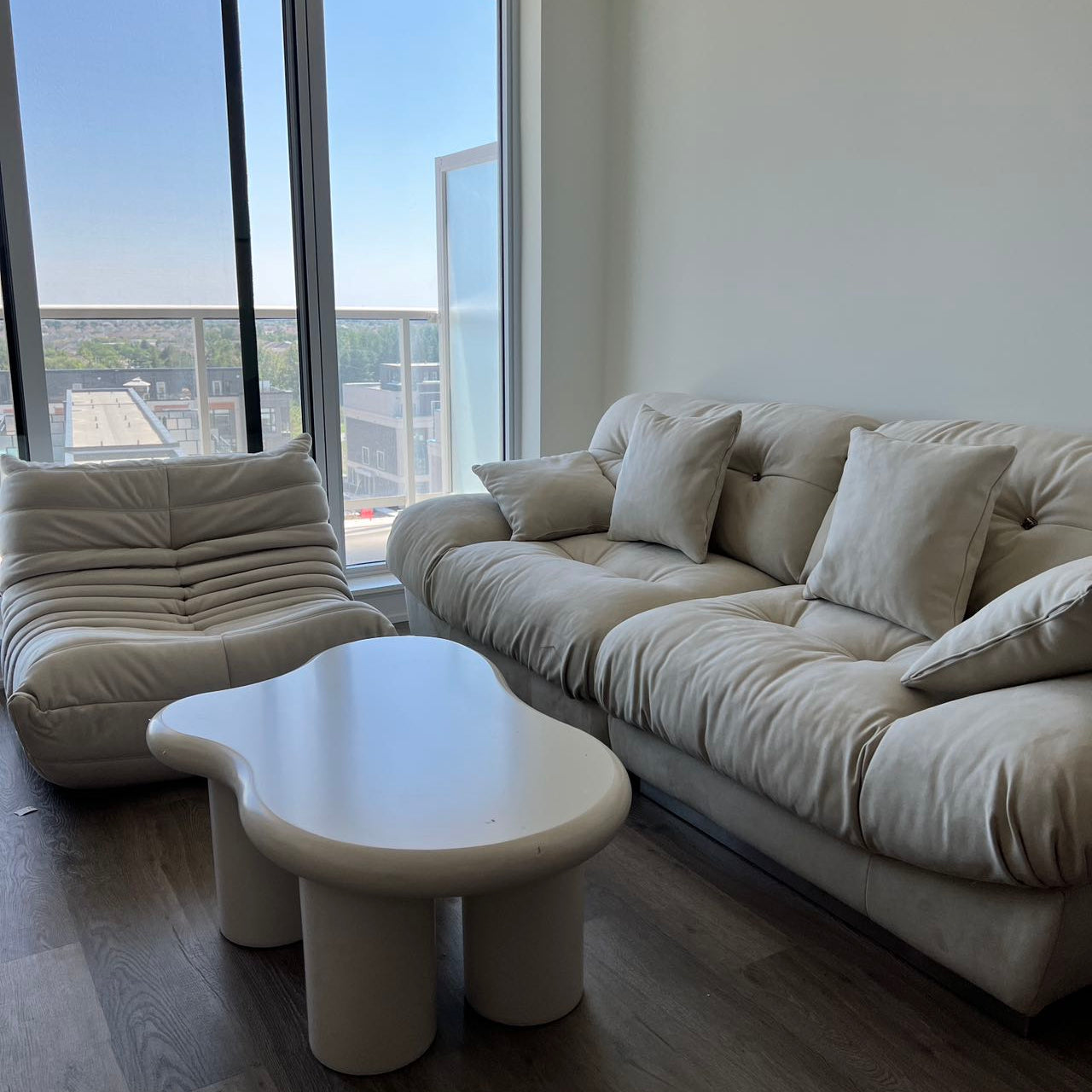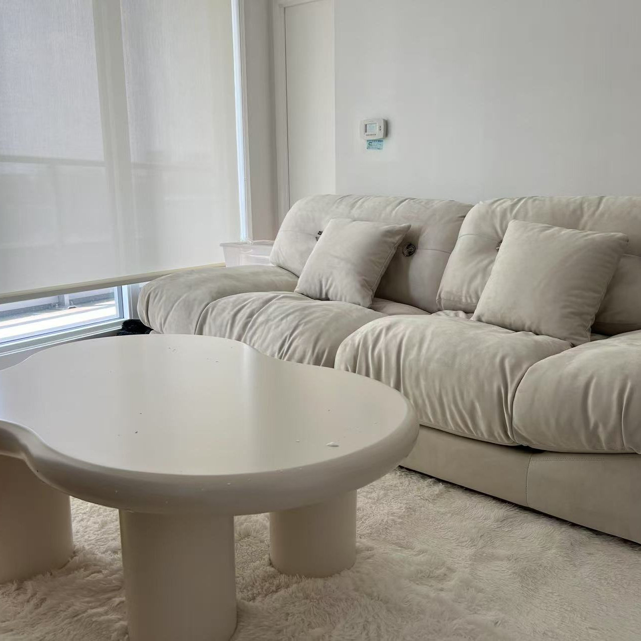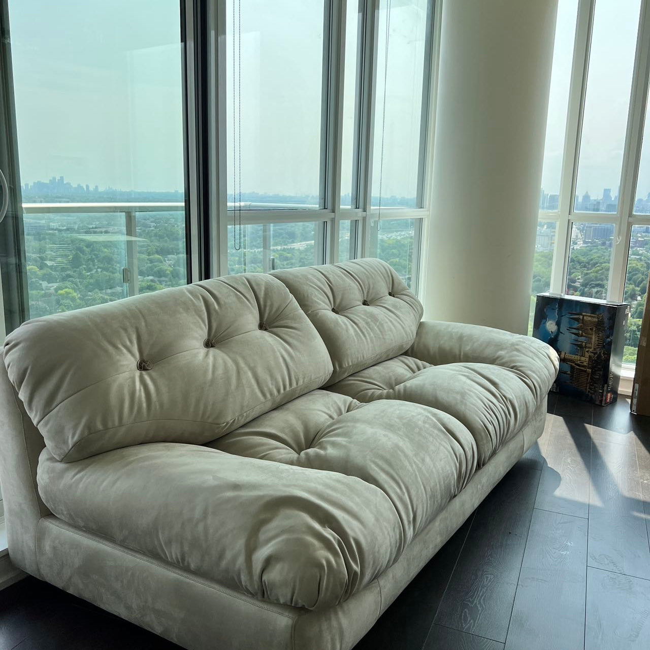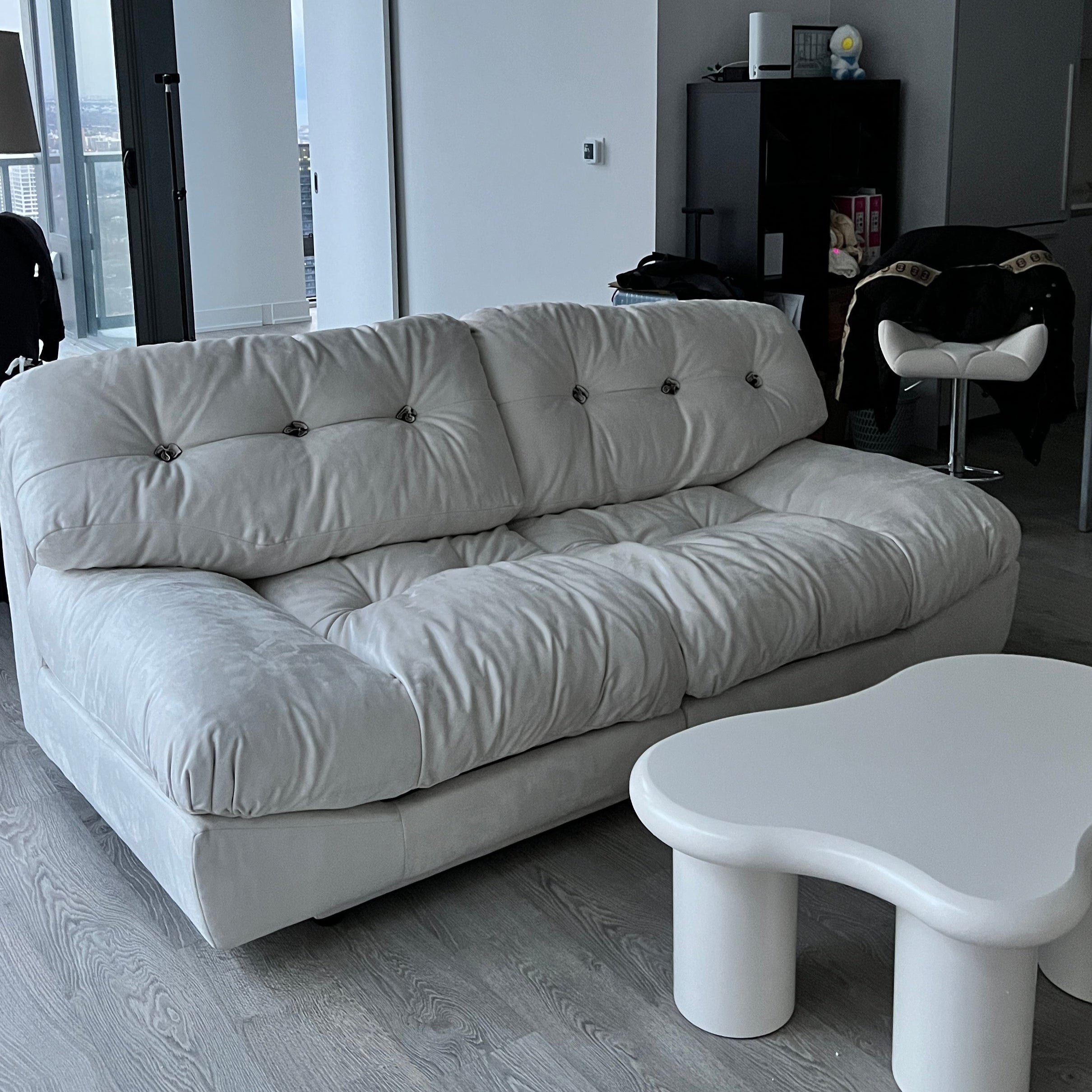The Italian-style Cloud Sofa combines luxury and modern elegance with its deep seating and plush tufted design in premium matte cloth fabric, resembling nubuck. The Italian pull button detailing adds comfort and visual appeal, while its low profile exudes contemporary charm, making it perfect for minimalist interiors. This expansive sofa invites relaxation and effortlessly becomes the centerpiece of any space.