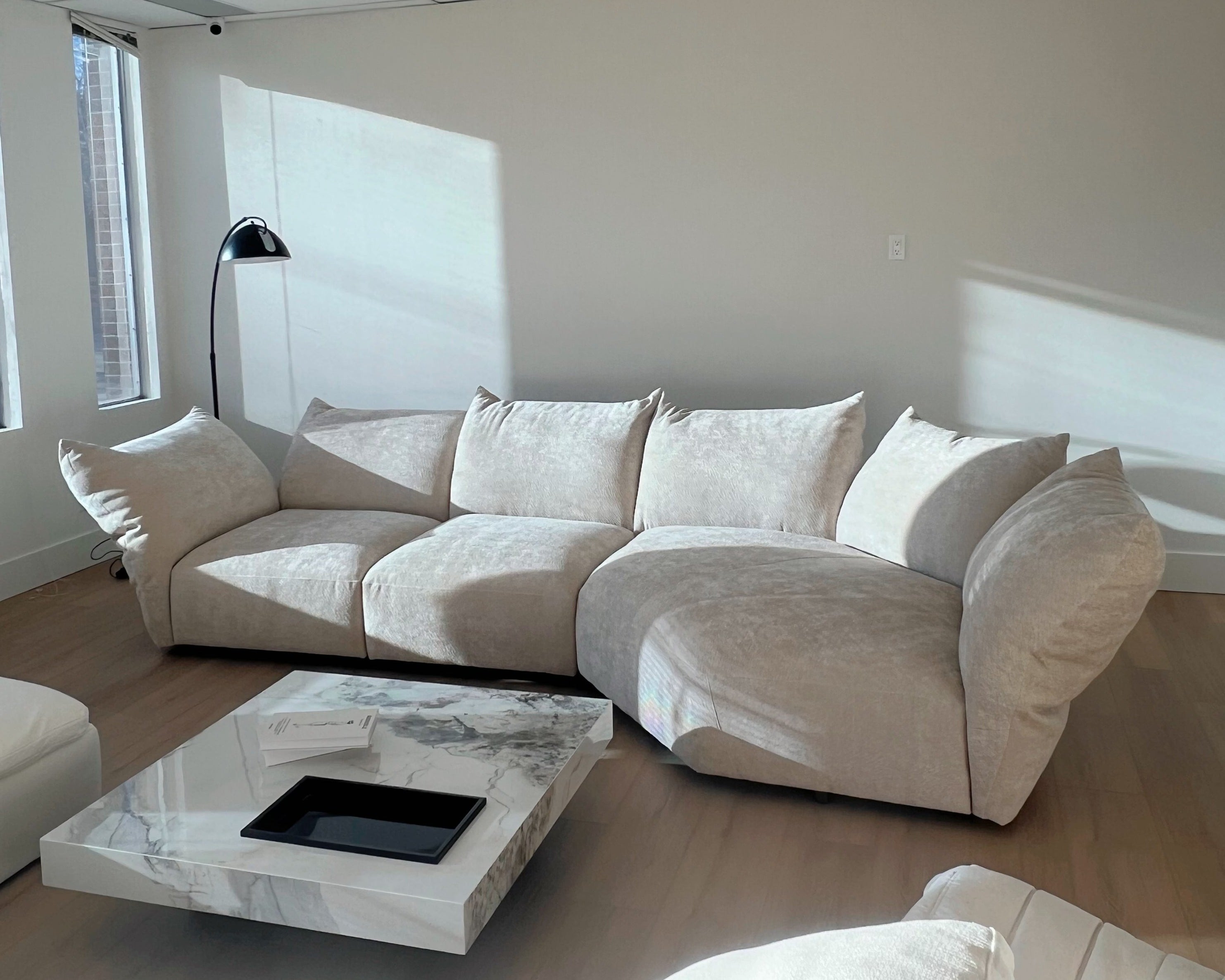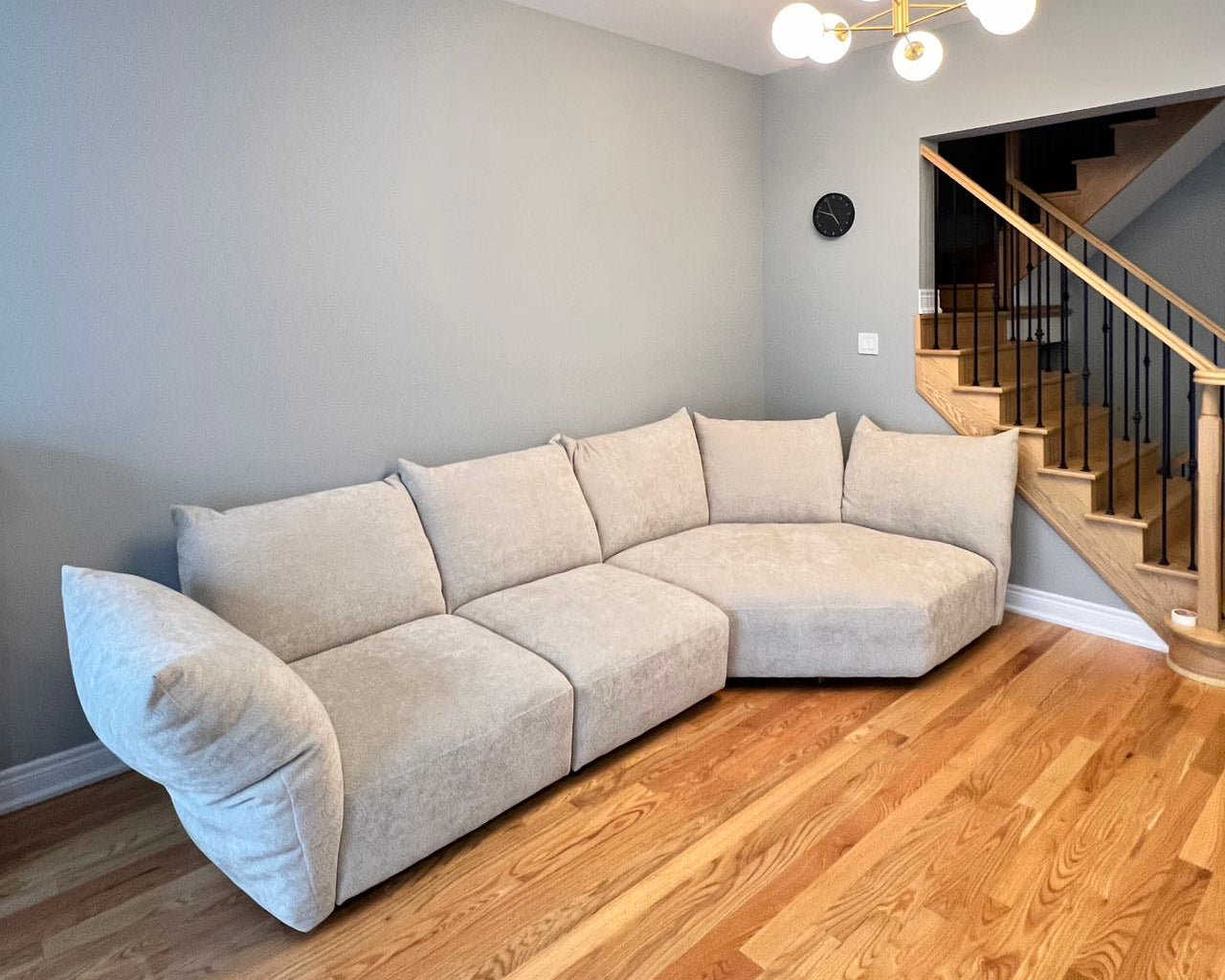 Introducing the "Blooming Embrace Sofa," a luxurious centerpiece for any contemporary living room. This plush, curved sectional offers an inviting silhouette with its generous, deep-seated cushions and soft, textured fabric. The sofa's adjustable back allows for customized seating experiences. Designed to provide ultimate comfort, the sofa's neutral tones and modern aesthetic make it an adaptable and stylish choice for a variety of home decors.