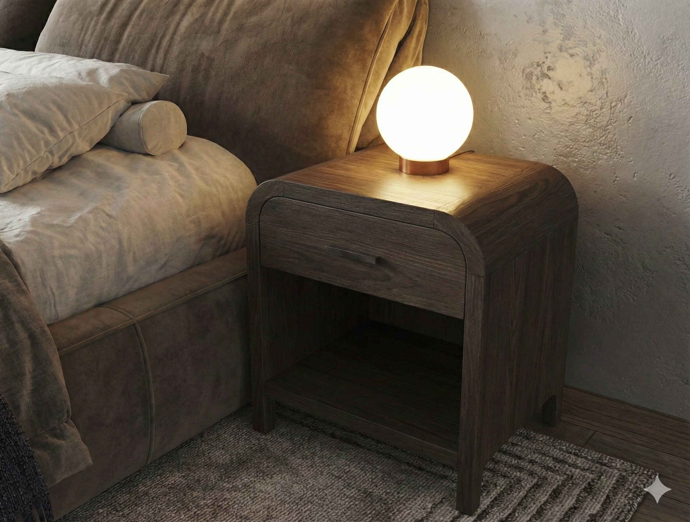 The Eamon Wood Nightstand merges timeless craftsmanship with modern convenience. Crafted from rubberwood with oak wood veneer with softly rounded edges, its minimalist silhouette brings warmth and balance to any bedroom. A built-in charging station at the back keeps your devices powered without clutter, while the smooth-glide drawer and open shelf provide ample storage for nightly essentials. Available in natural oak and dark walnut finishes, Eamon embodies simplicity, function, and enduring design.