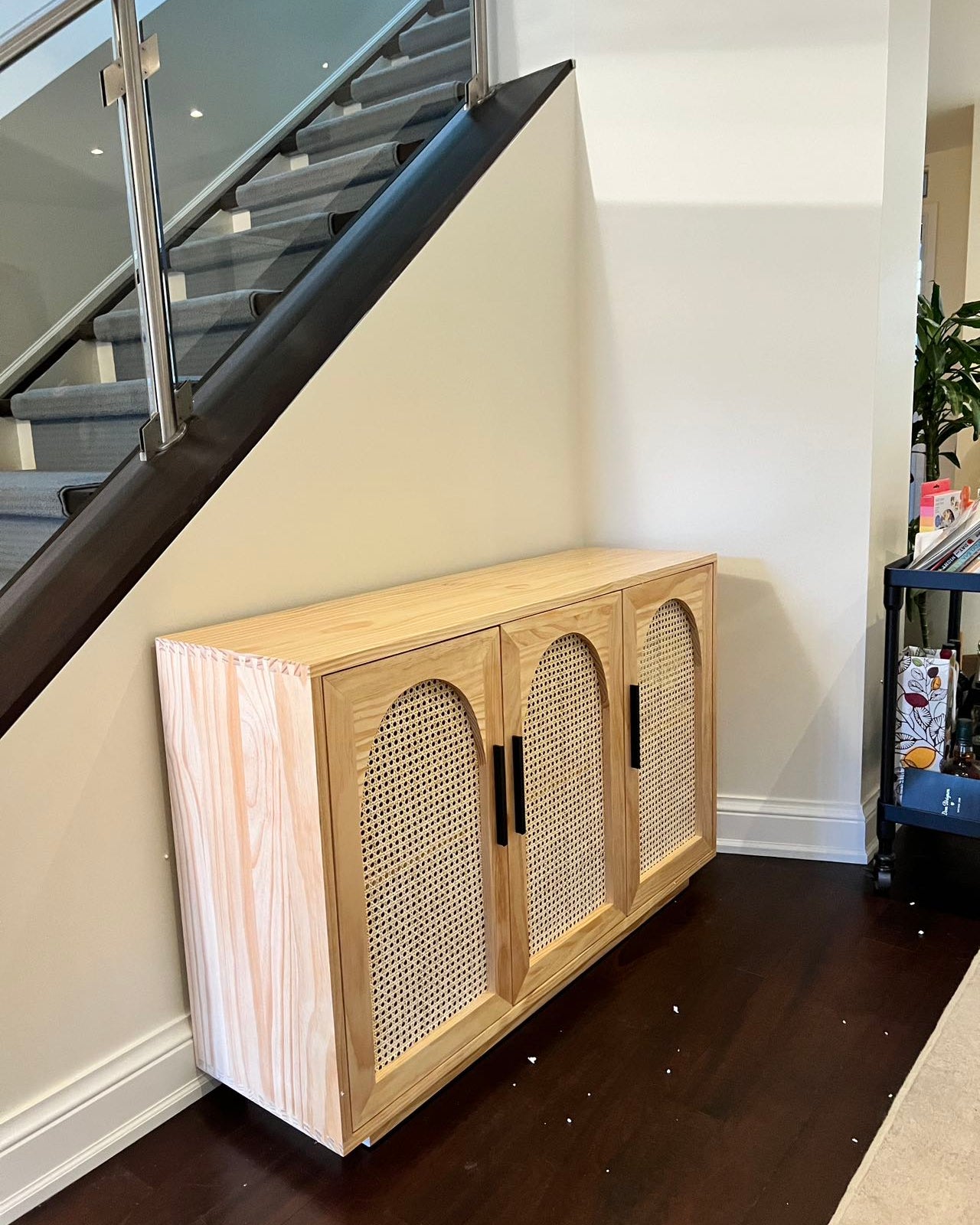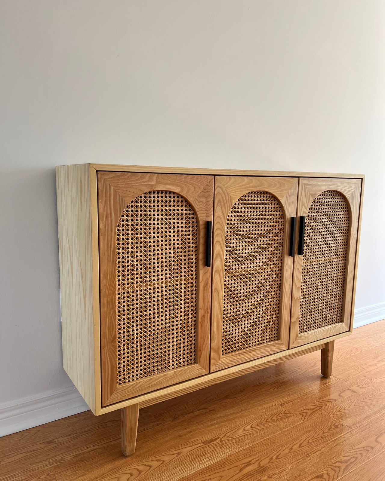 Enhance your home with the "Elegance Rattan Arch Sideboard," a beautifully crafted storage solution that blends modern and classic design elements. Made from high-quality white ash wood, this sideboard features three arched doors with intricate rattan detailing, offering ample storage and a visually striking appearance. This piece ensures durability and adds a touch of elegance to any interior decor.