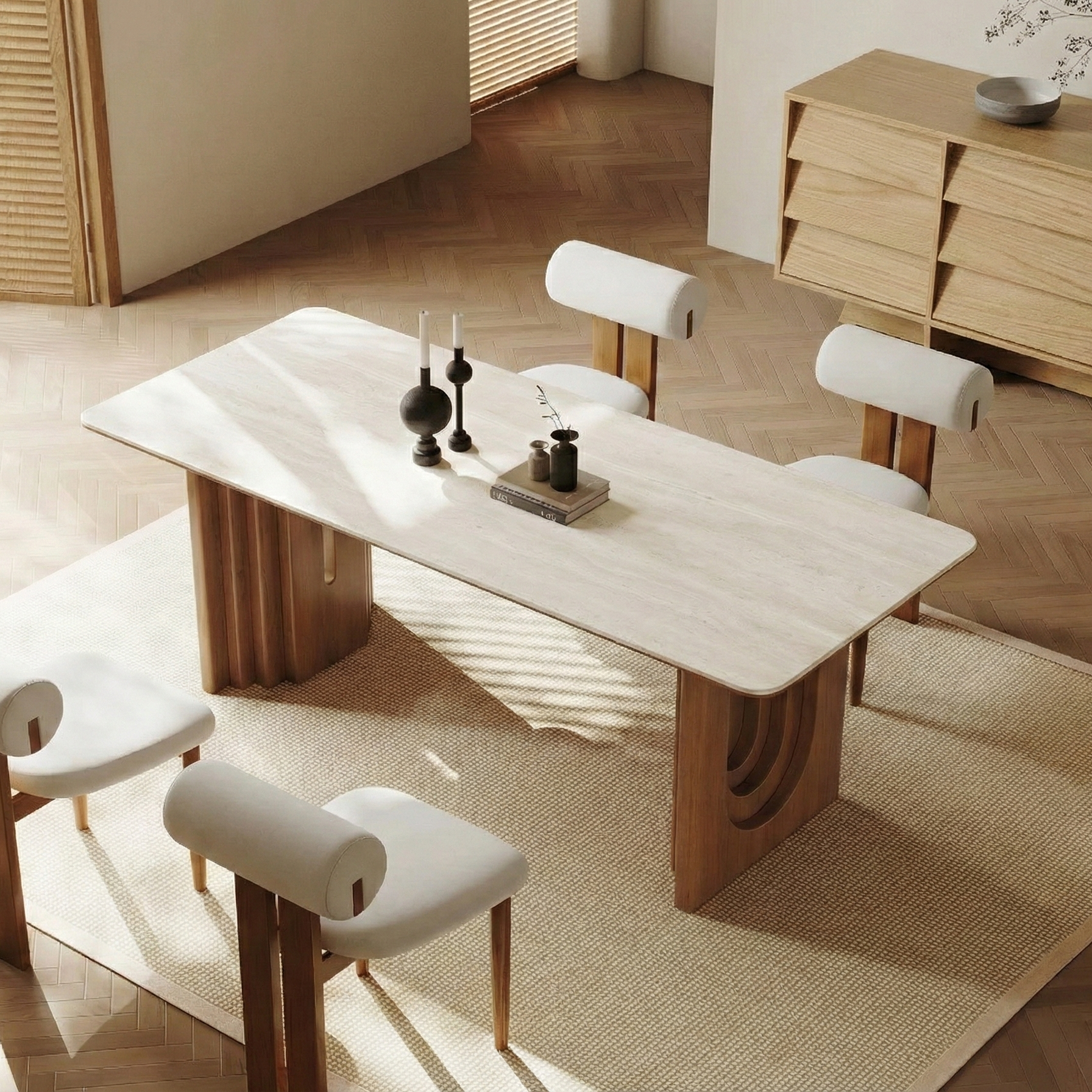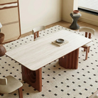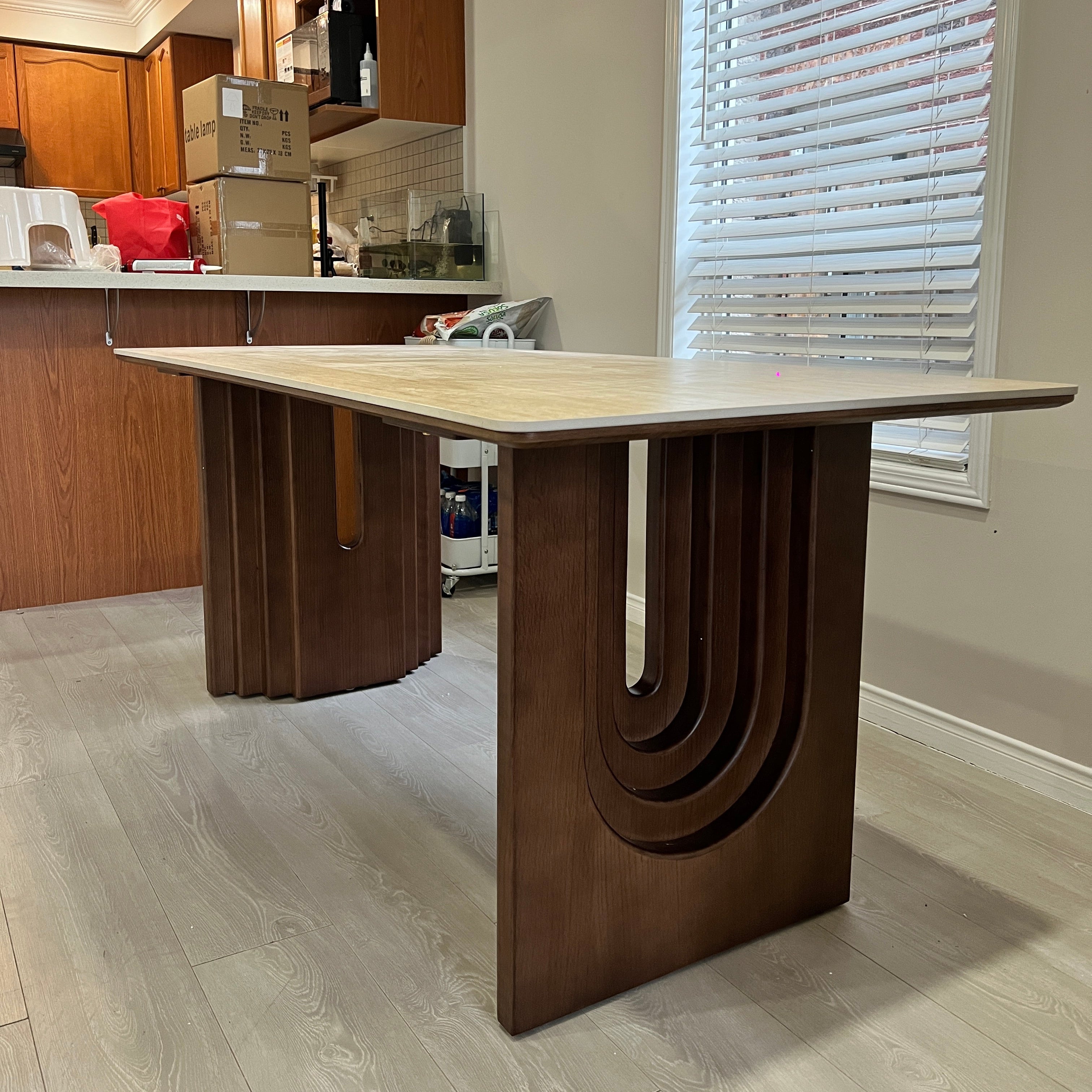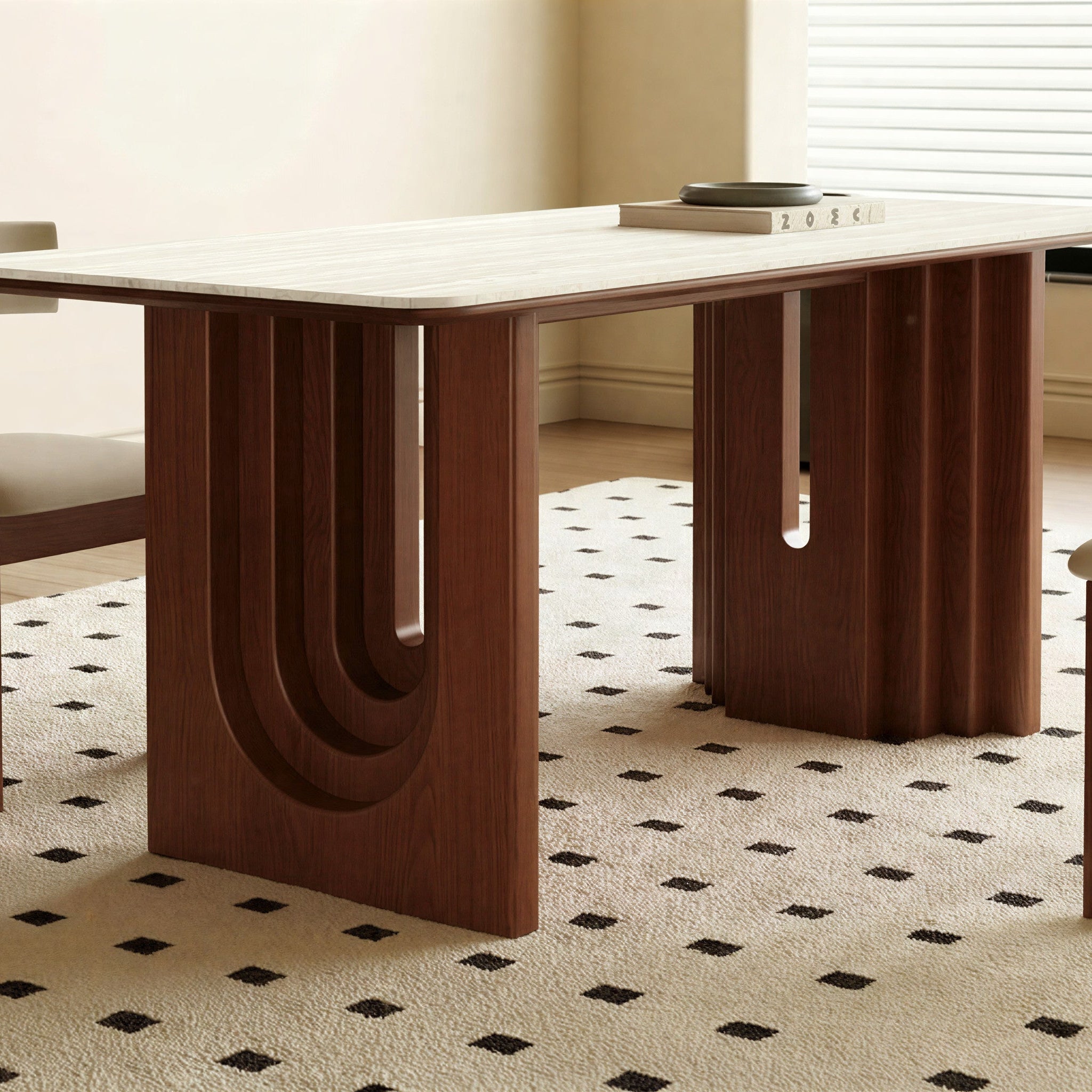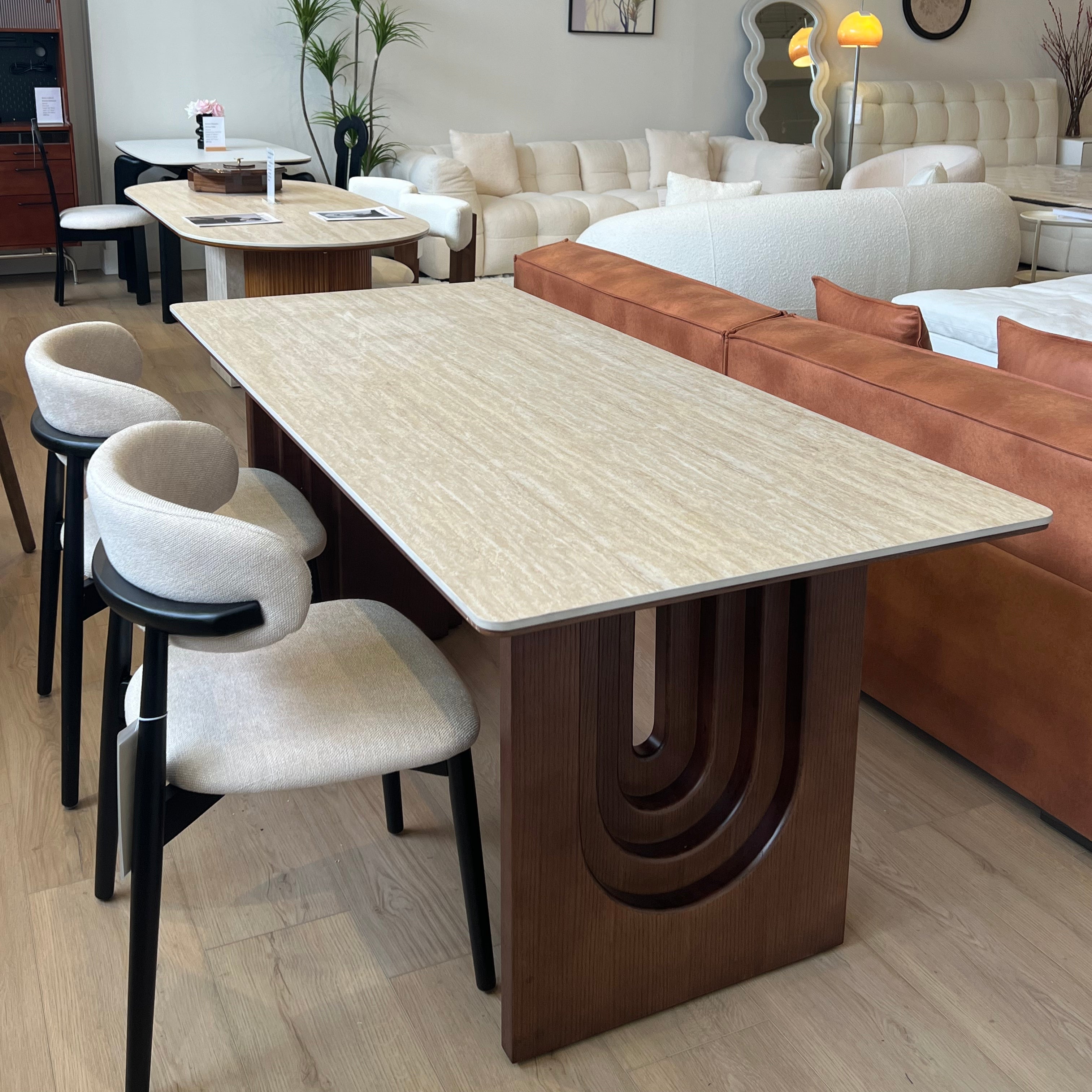 This stunning piece features a beautifully crafted walnut base with unique, gracefully curved arcs that create a harmonious and captivating visual appeal. The table is topped with a luxurious, smooth surface that not only enhances its sophisticated look but also provides ample space for dining and entertaining.