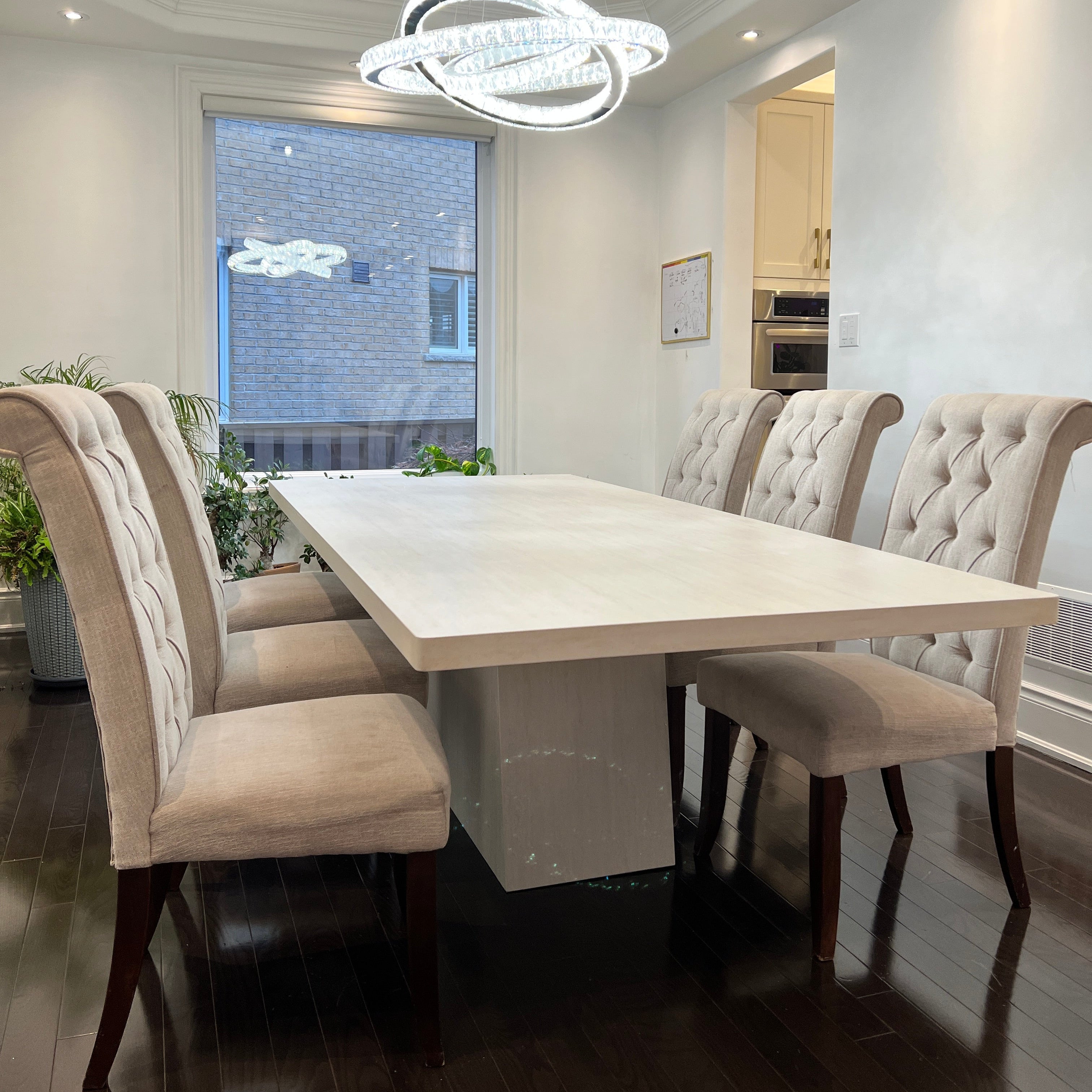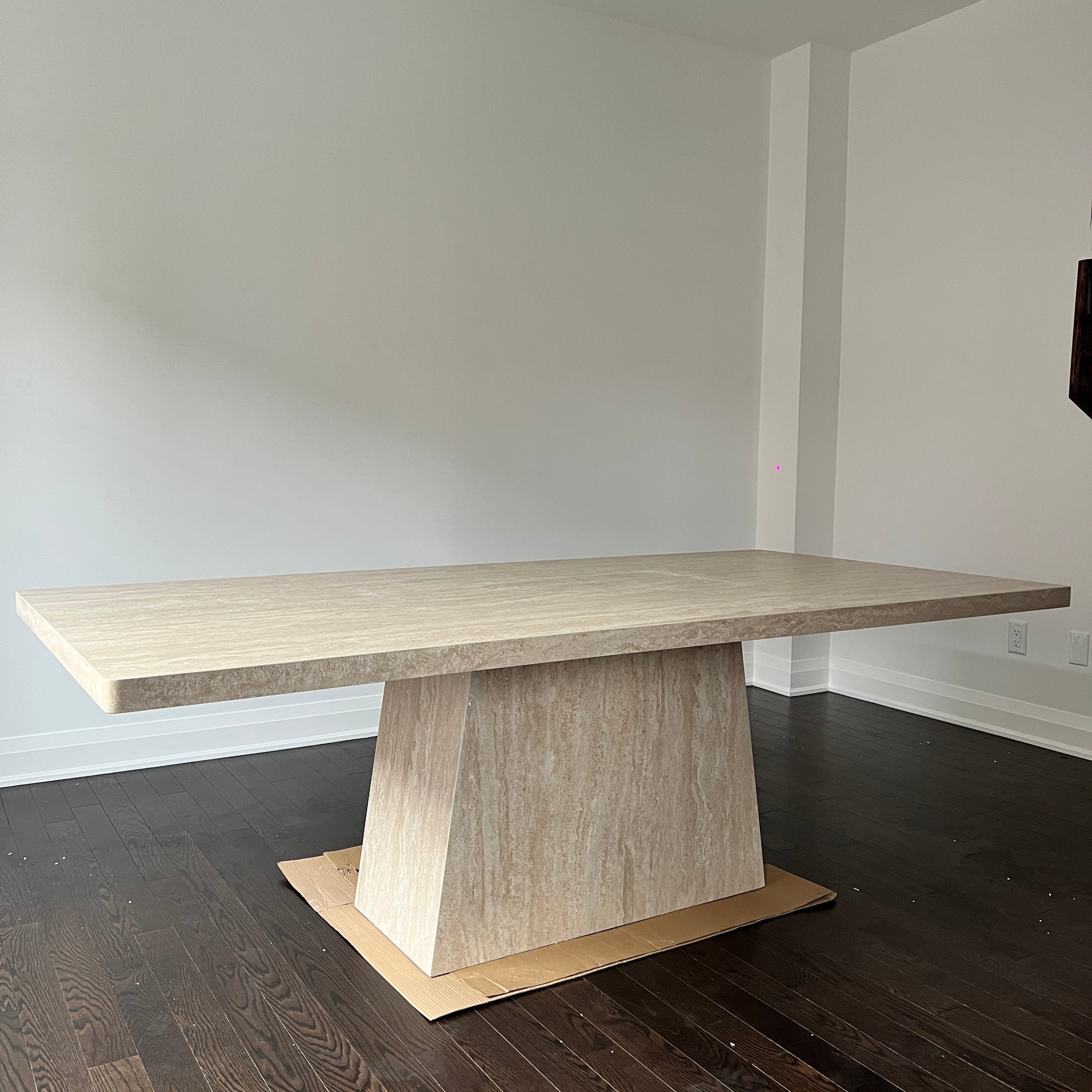 TheArdella Dining Tablecaptures refined minimalism through its clean lines and solid form. Constructed from travertine-look sintered stone, it offers the natural elegance of stone with the resilience of modern material—resistant to heat, scratches, and stains. Its smooth rectangular top and monolithic pedestal base ground any dining space with sculptural presence. Perfectly suited for contemporary and organic interiors alike, Ardella balances function with understated beauty.
