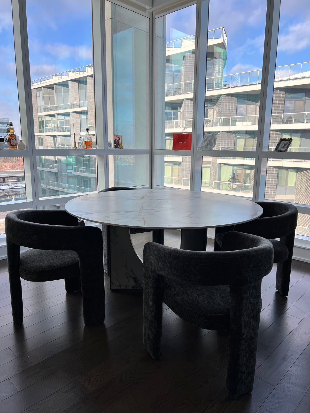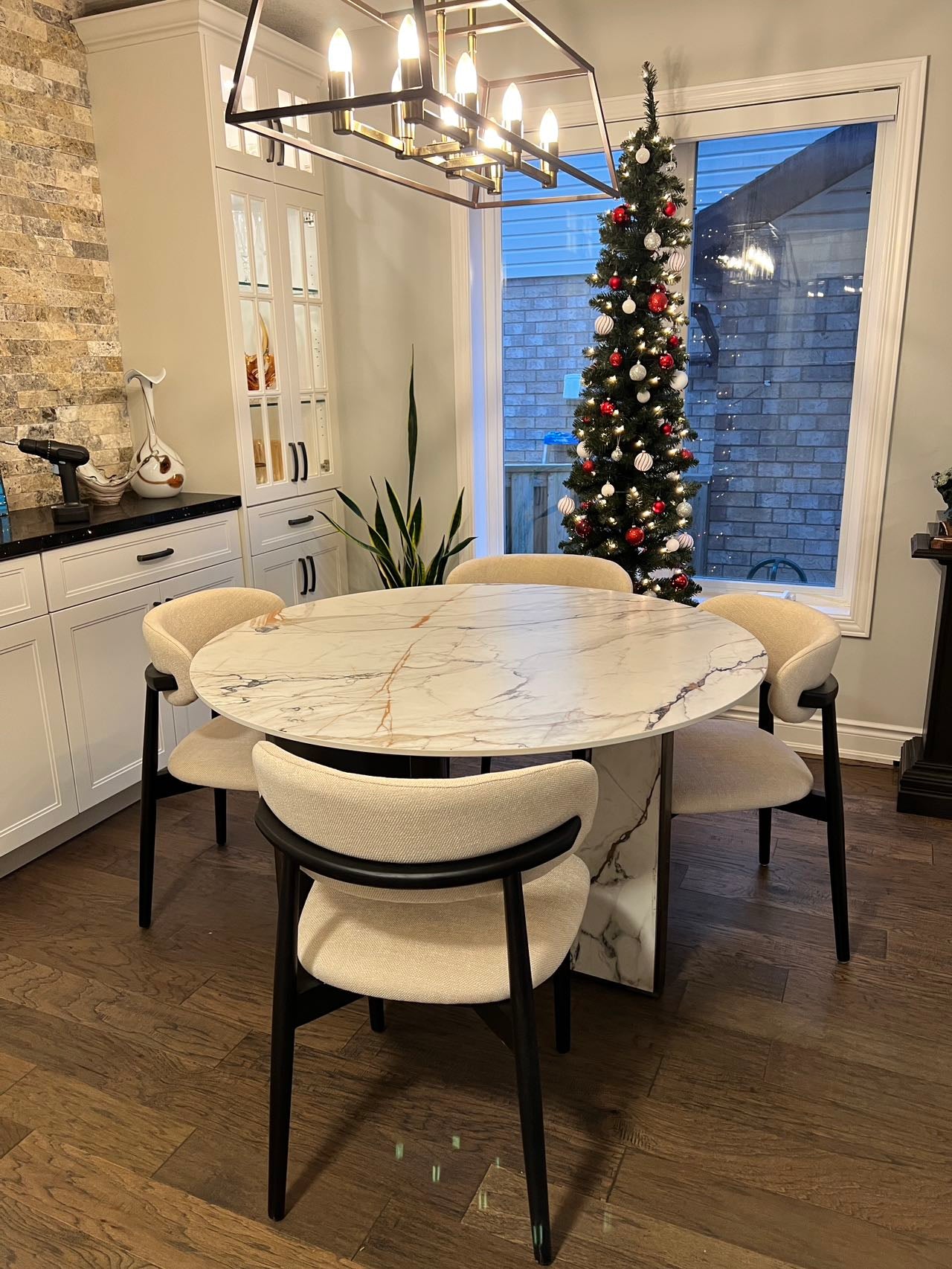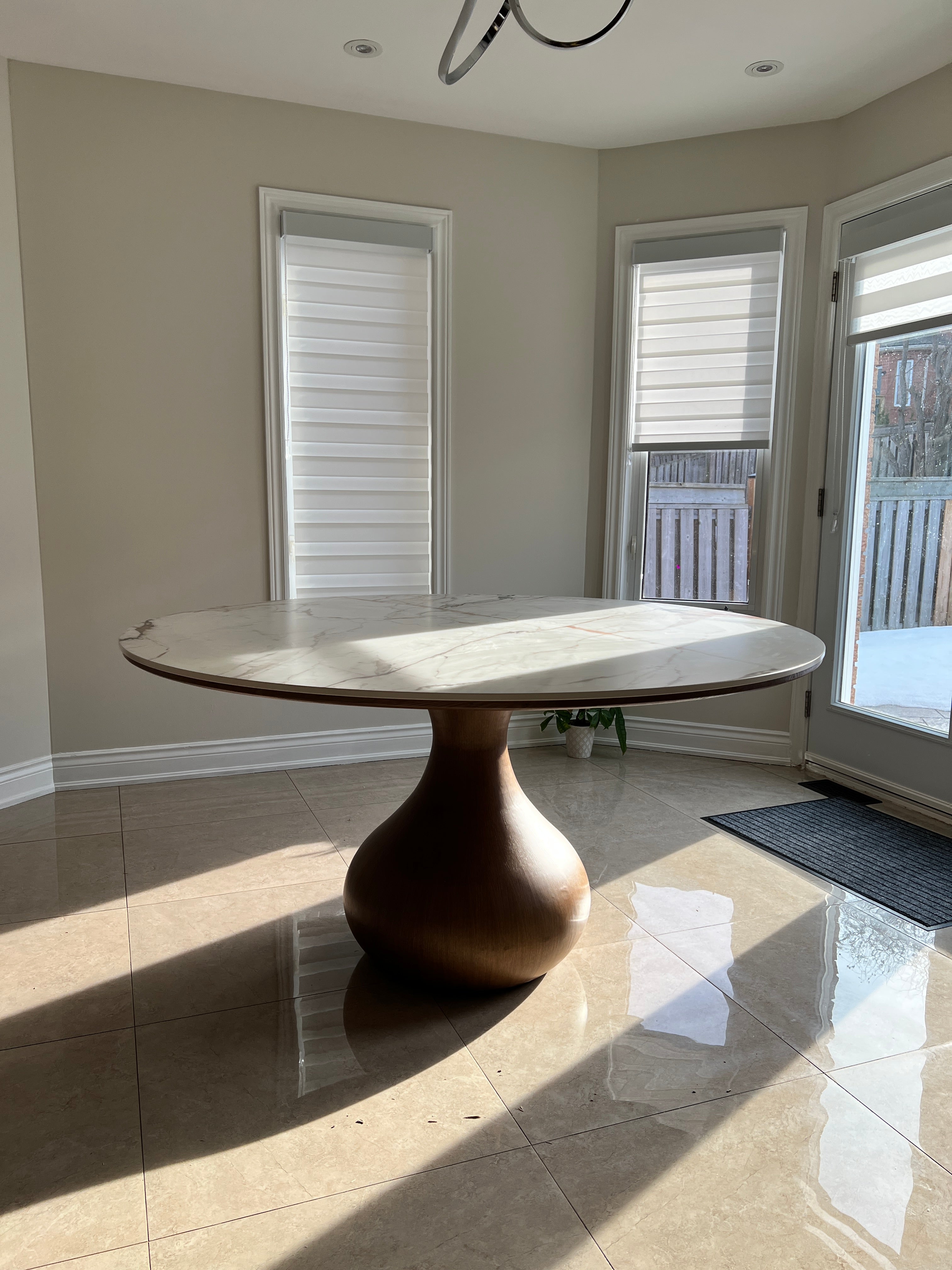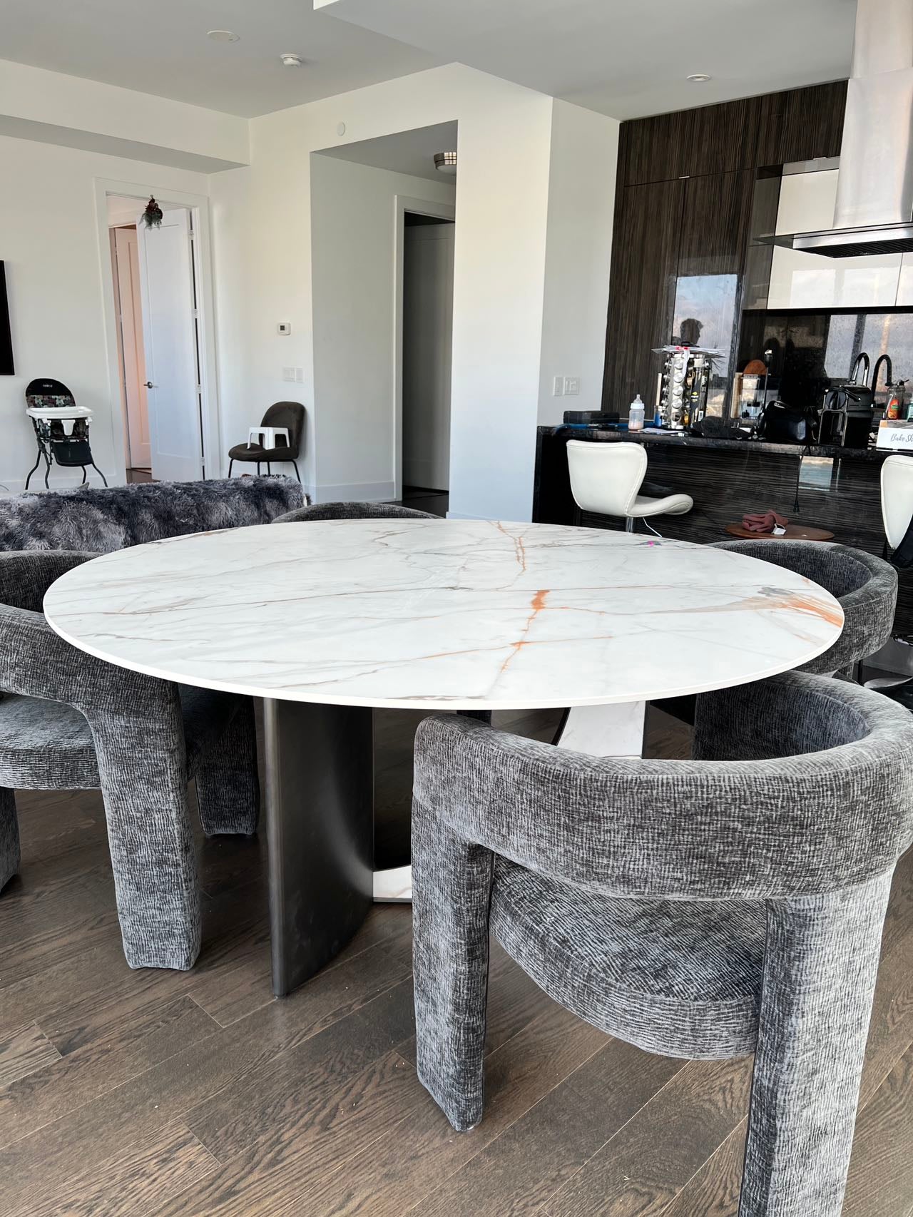 The Celestia Marble Elegance Dining Table is an exquisite centerpiece designed to elevate any modern dining space with its elegance and style. This table features a large, round top made from premium quality sintered stone, characterized by its striking white background and bold grey veining, ensuring that no two pieces are exactly alike. The sintered stone top is supported by a robust and uniquely shaped base, which is also clad in matching for a seamless, luxurious look.