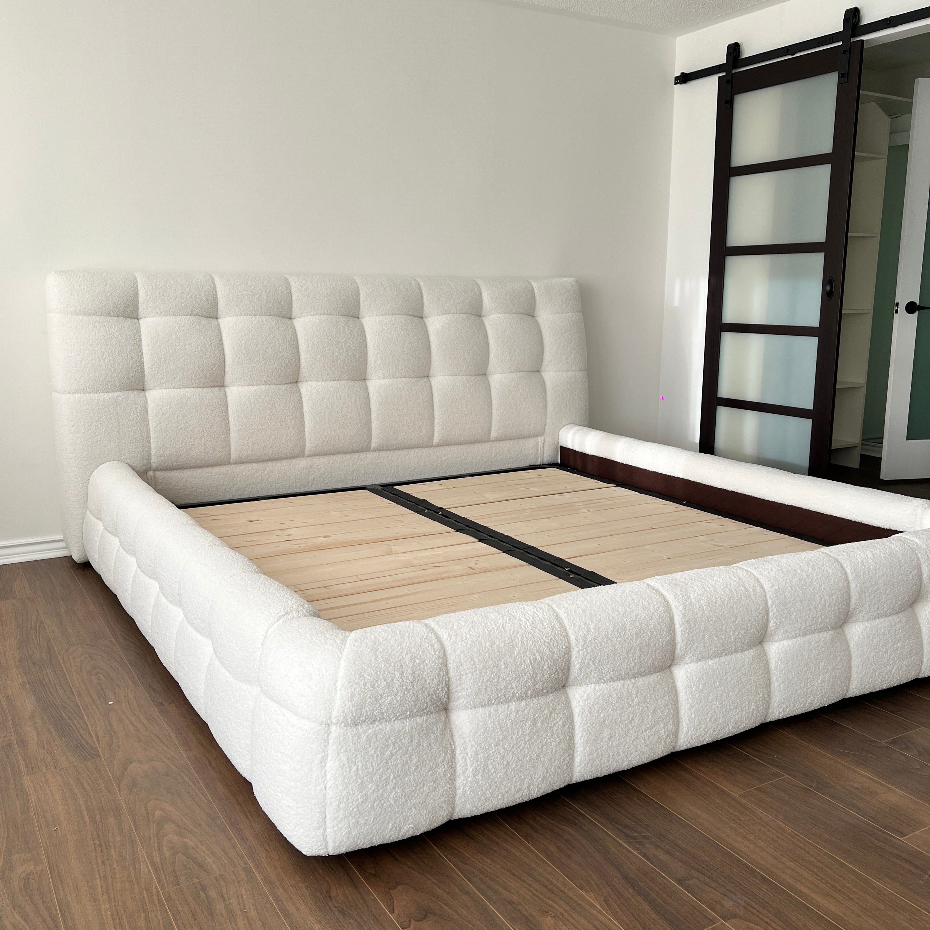The chic, padded headboard with a squared tufting design, providing both comfort and a touch of elegance to any modern bedroom. The frame's upholstery features a bouclé fabric in a soft cream color, lending a cozy yet sophisticated texture to the room's ambiance. With a solid platform base and wooden slats, the bed is designed to support a mattress without the need for a box spring.